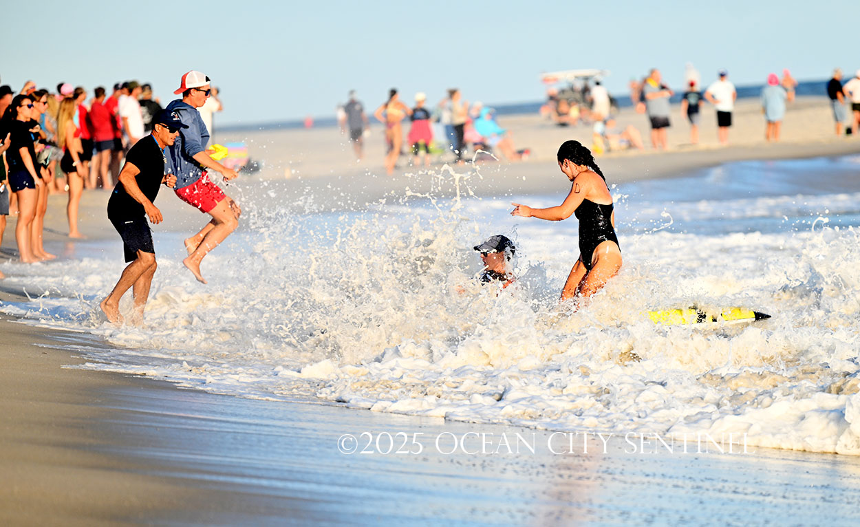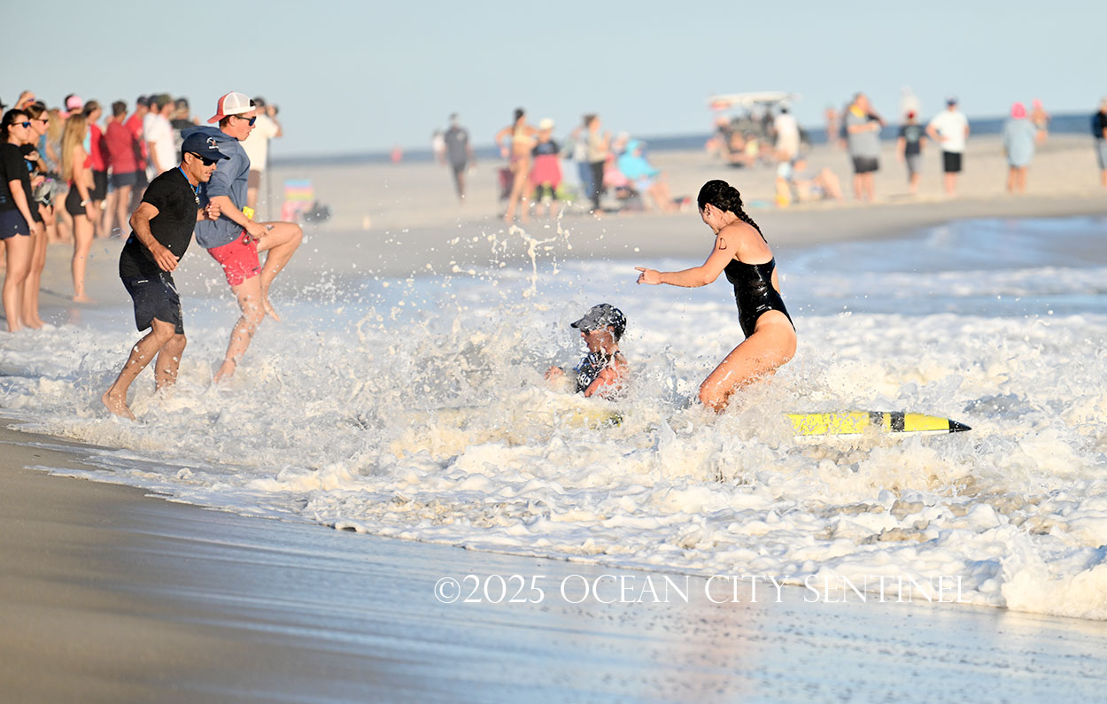 The many races in the South Jersey Lifeguard Chiefs Association summer competitions feature a lot of swimming, rowing, paddleboarding, running and surf-dashing, but there isn’t one quite like this.
