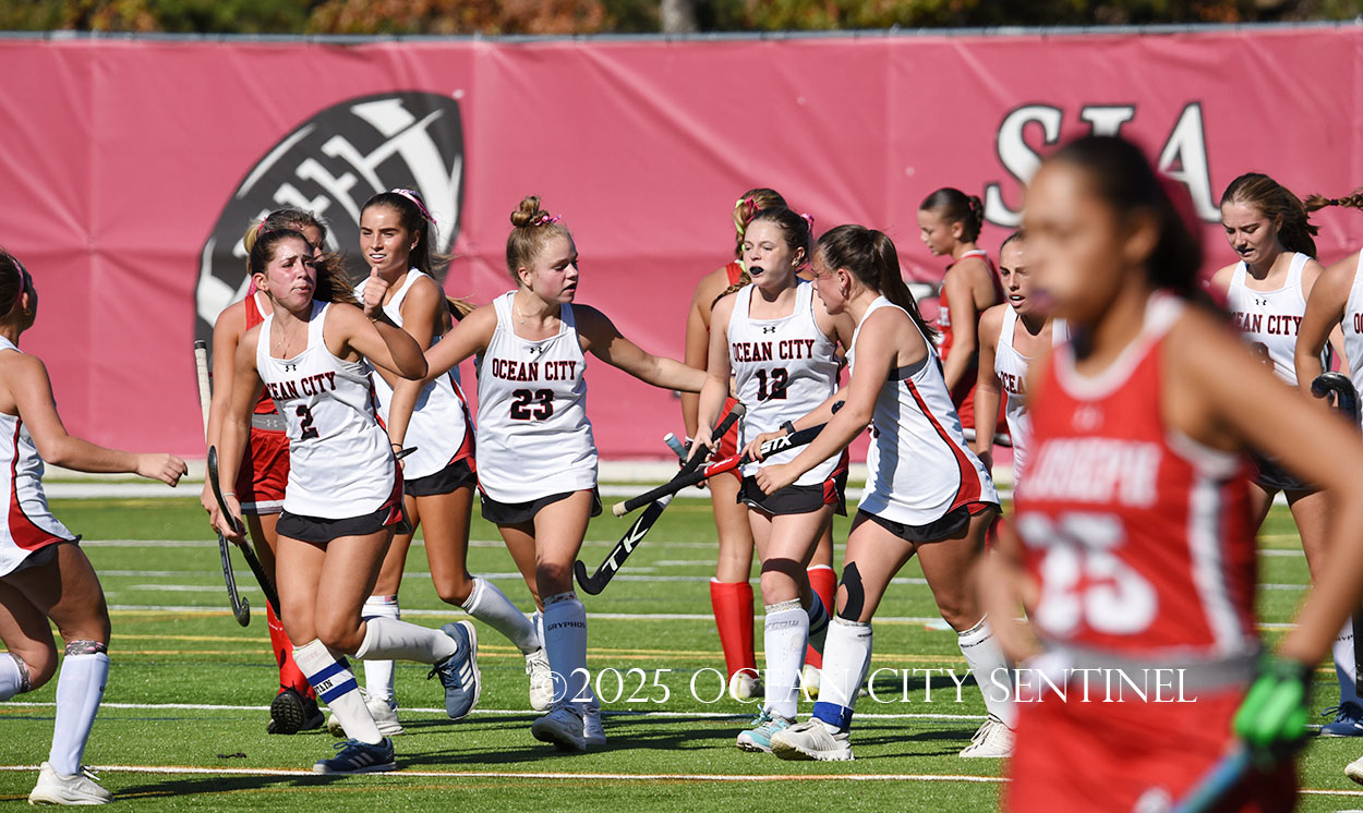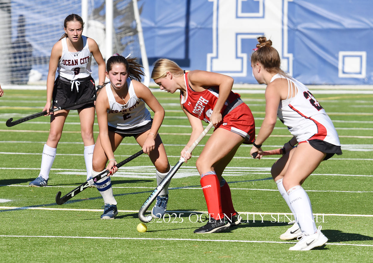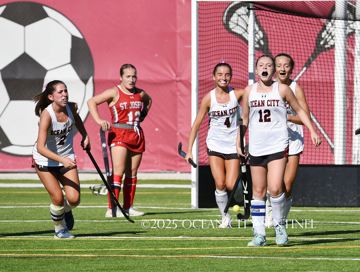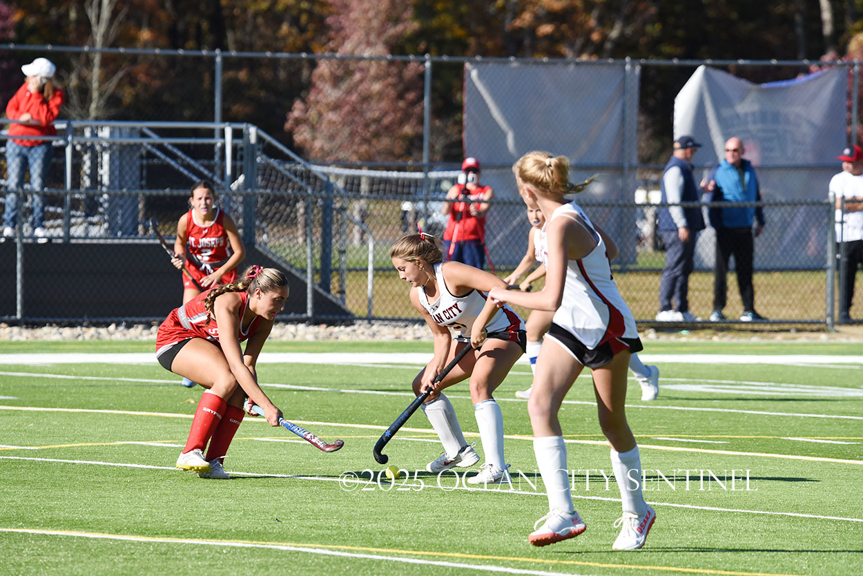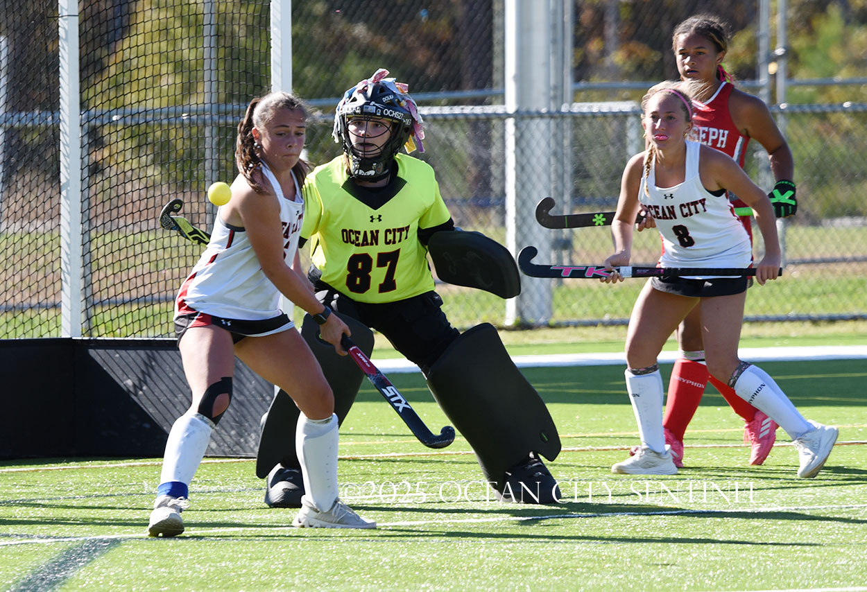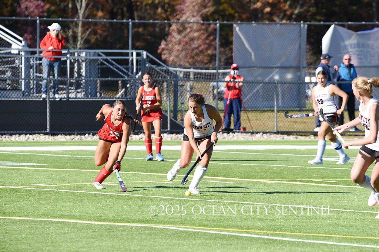 The two teams were tied 1-1 until near the end of the first half after St. Joe’s Stella Devlin scored and Ocean City’s Casey Adamson tied things up. With time running out in the half, Nina Aponte, who provided the assist on Devlin’s score, made it 2-1 off a corner play.