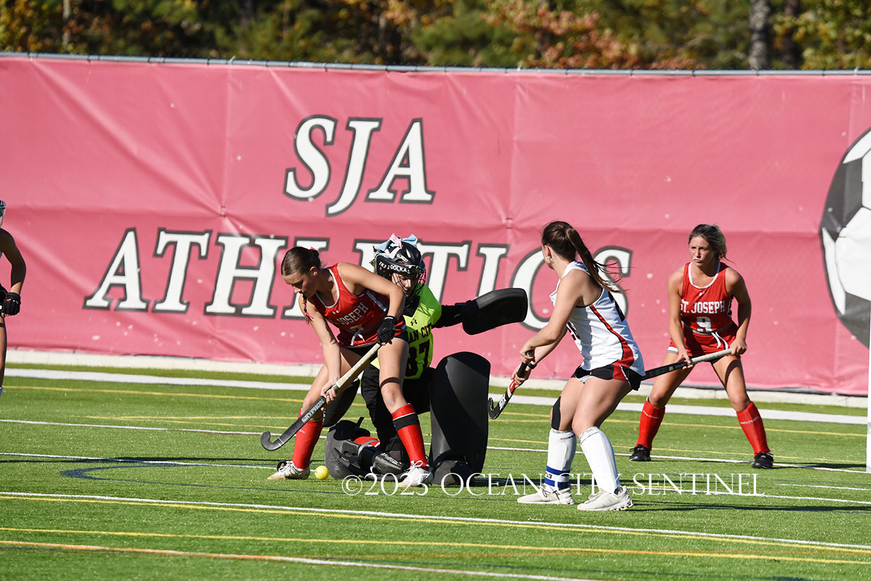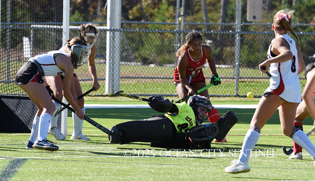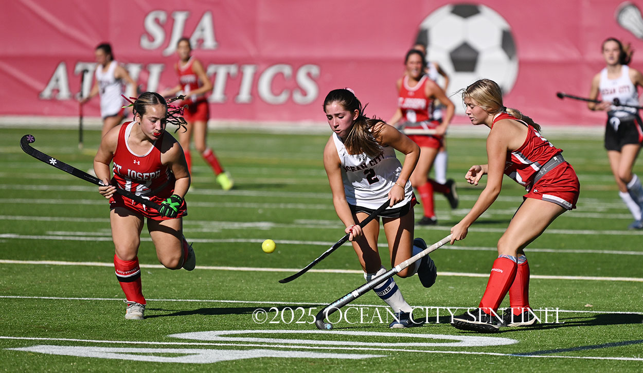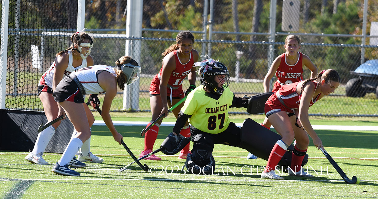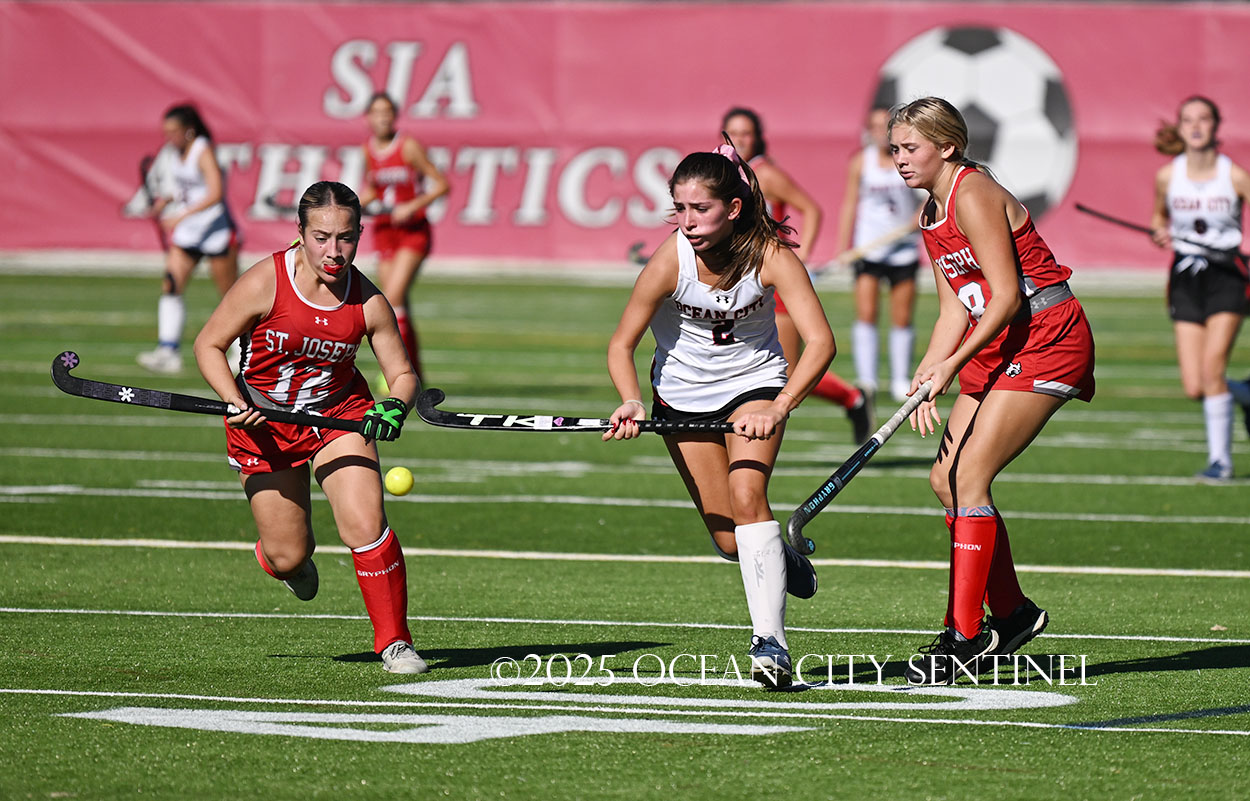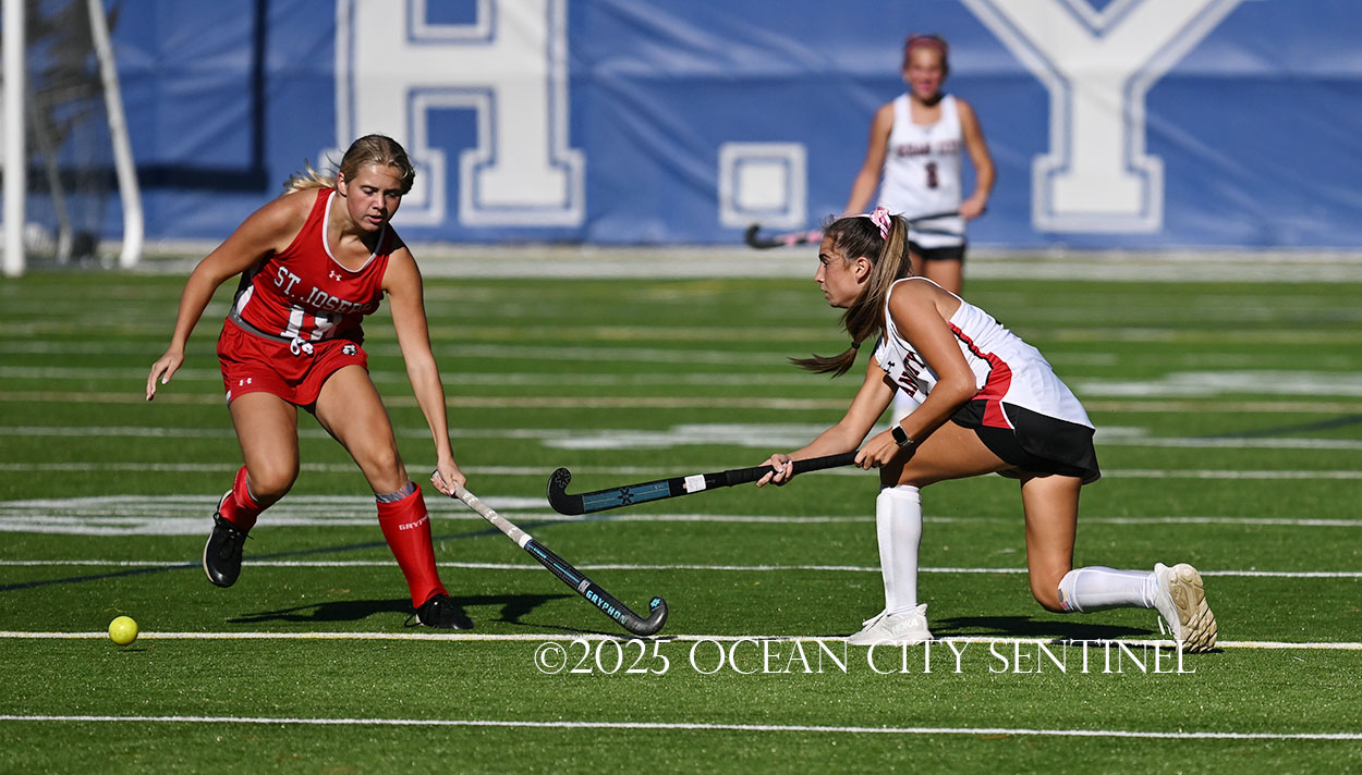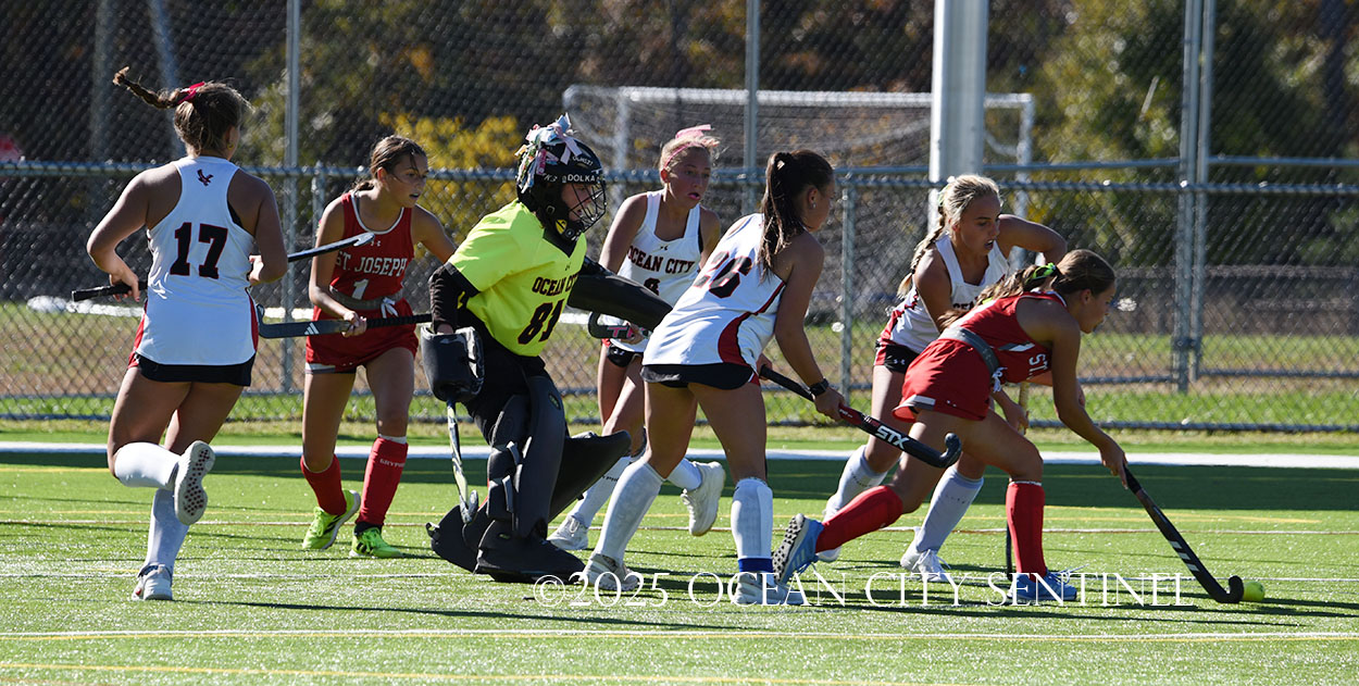 The two teams were tied 1-1 until near the end of the first half after St. Joe’s Stella Devlin scored and Ocean City’s Casey Adamson tied things up. With time running out in the half, Nina Aponte, who provided the assist on Devlin’s score, made it 2-1 off a corner play.