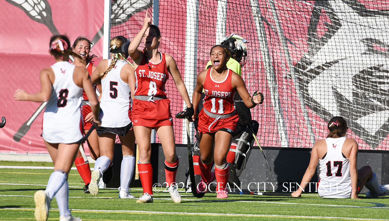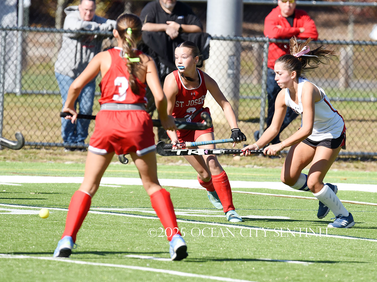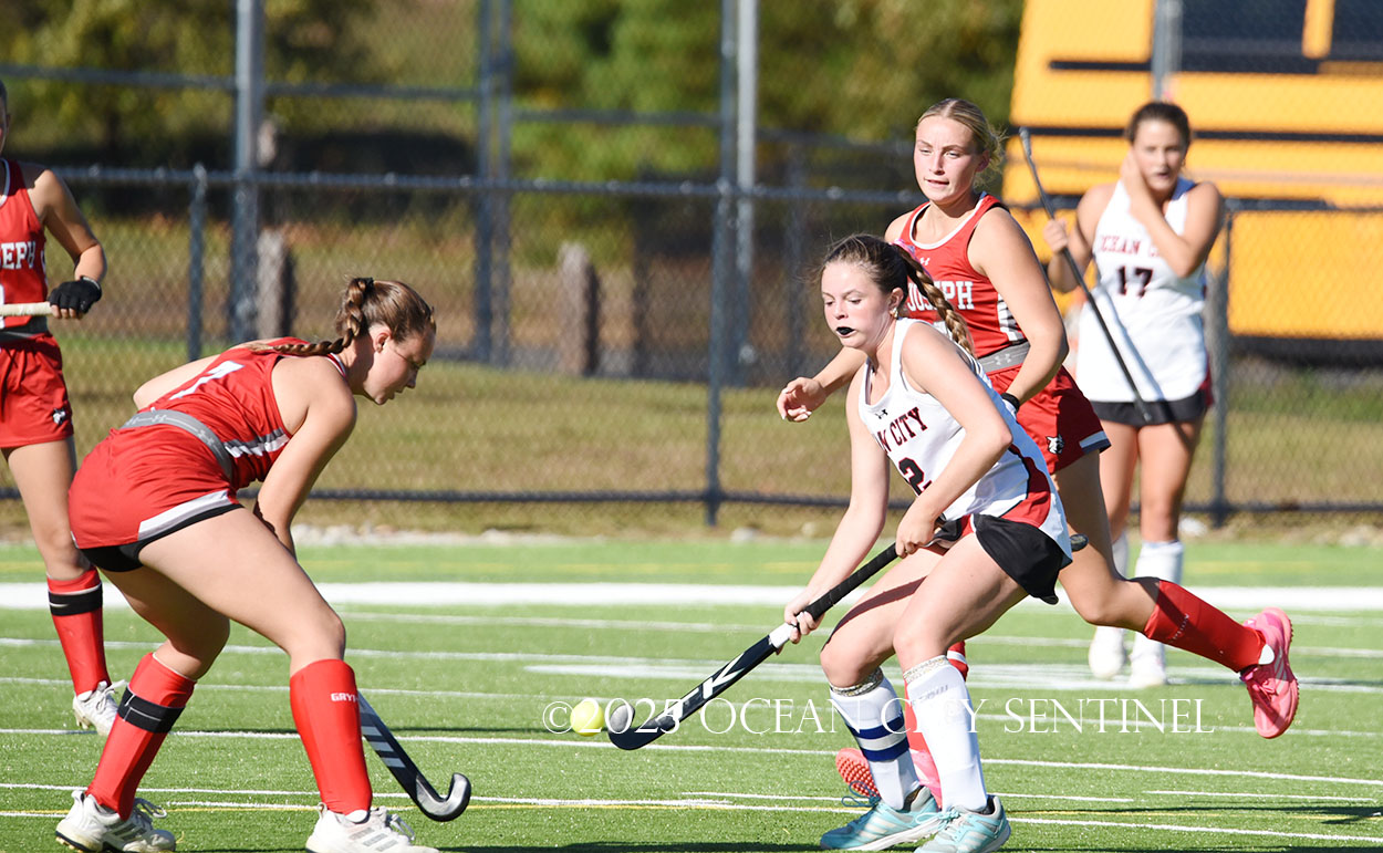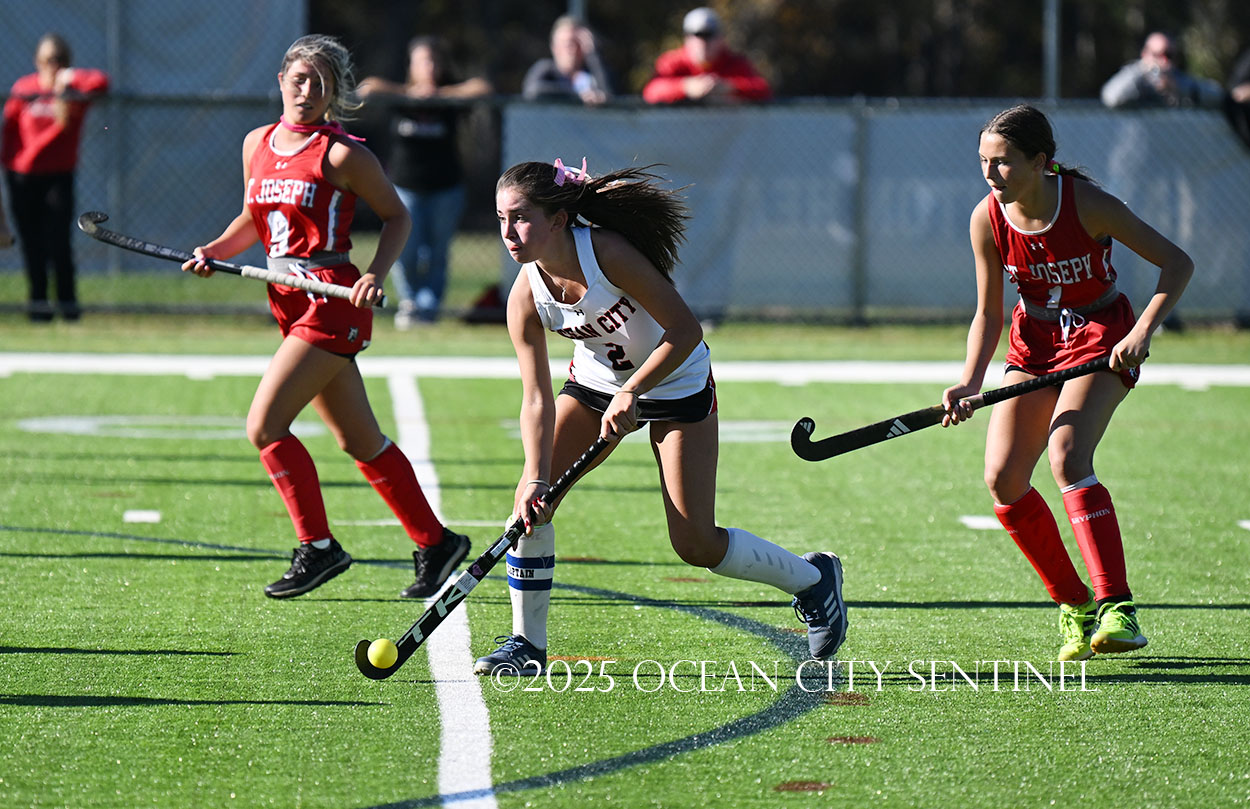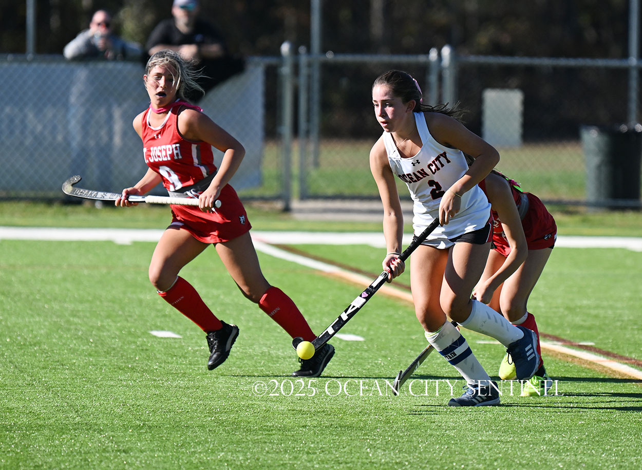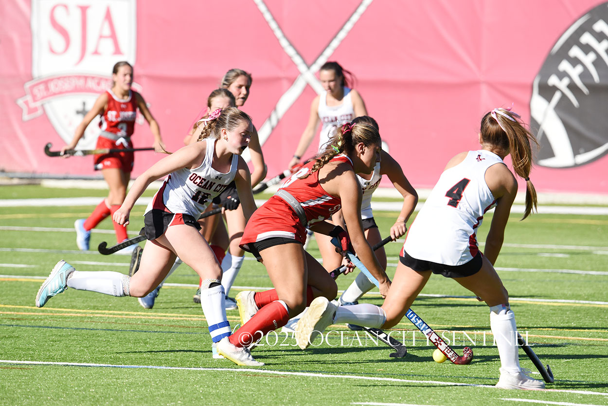 The two teams were tied 1-1 until near the end of the first half after St. Joe’s Stella Devlin scored and Ocean City’s Casey Adamson tied things up. With time running out in the half, Nina Aponte, who provided the assist on Devlin’s score, made it 2-1 off a corner play.