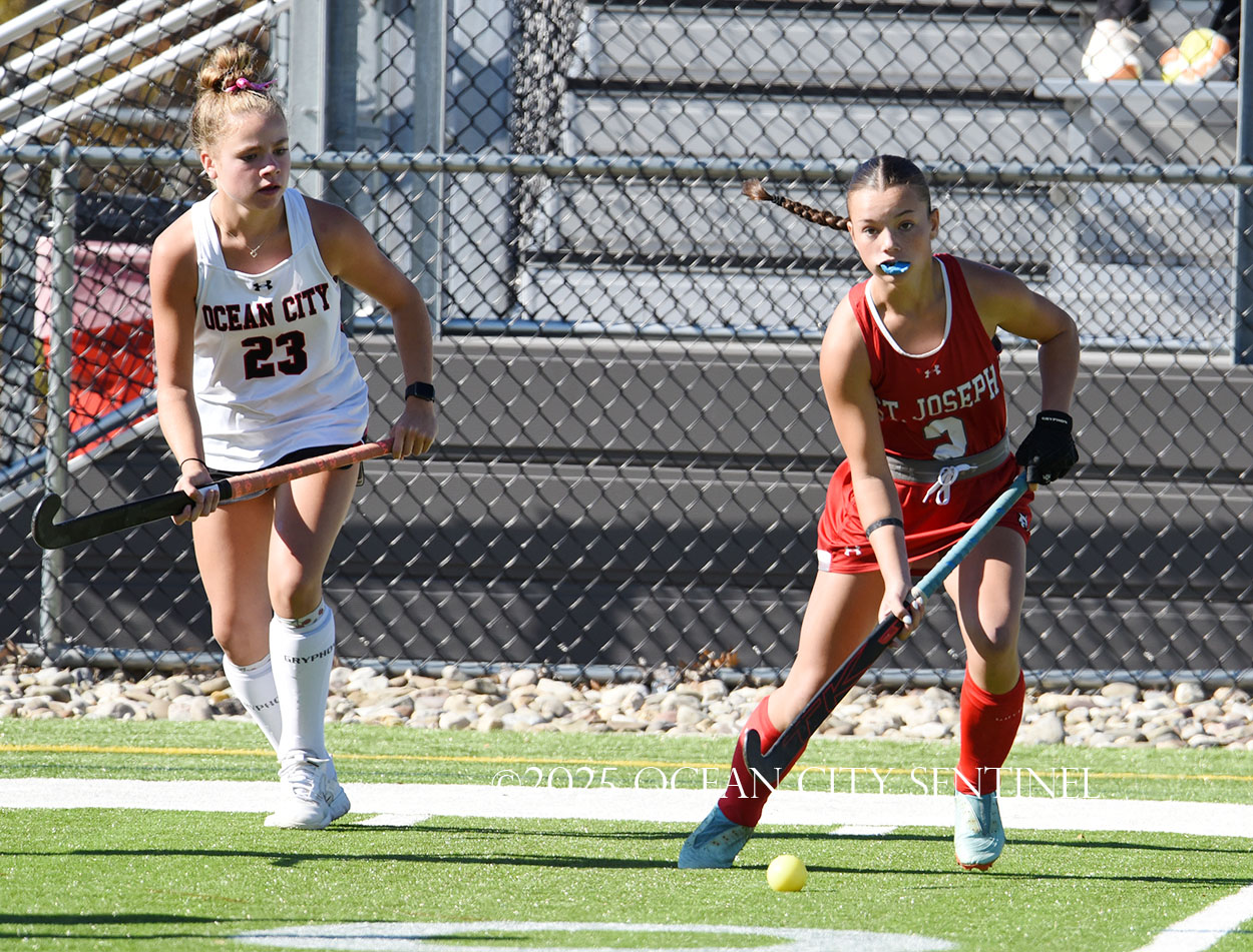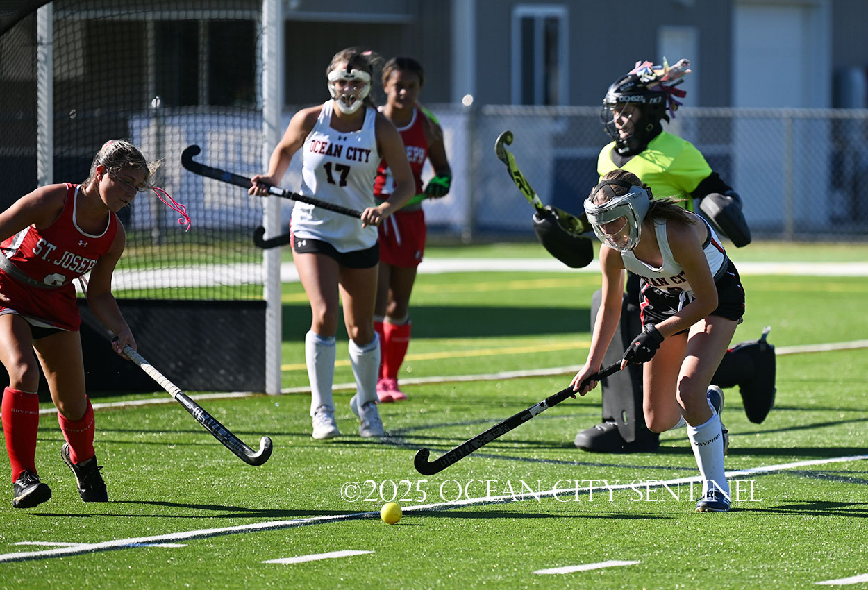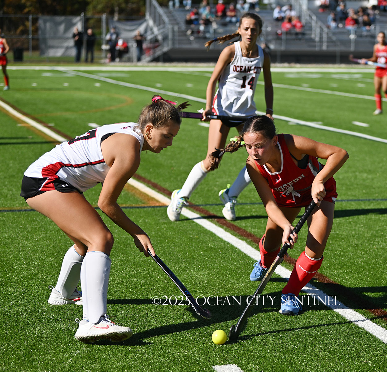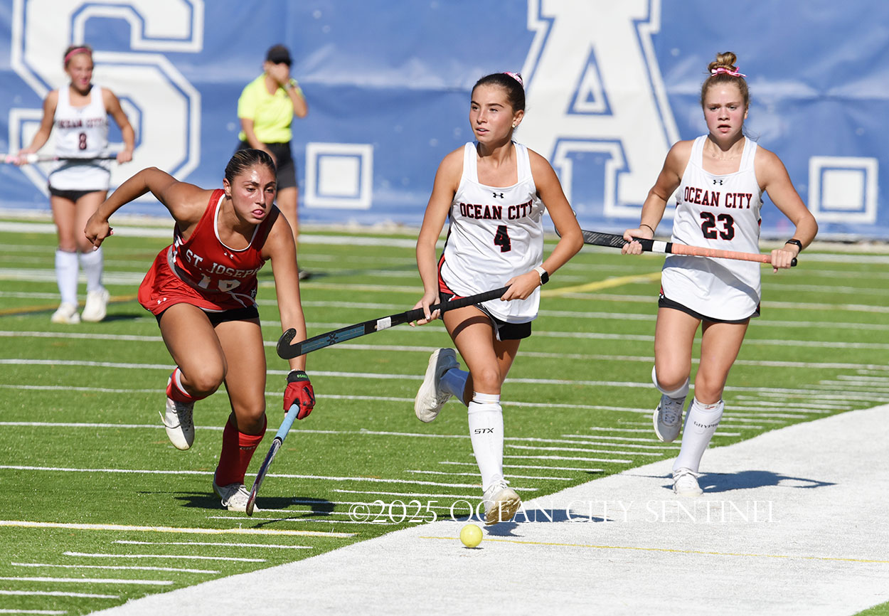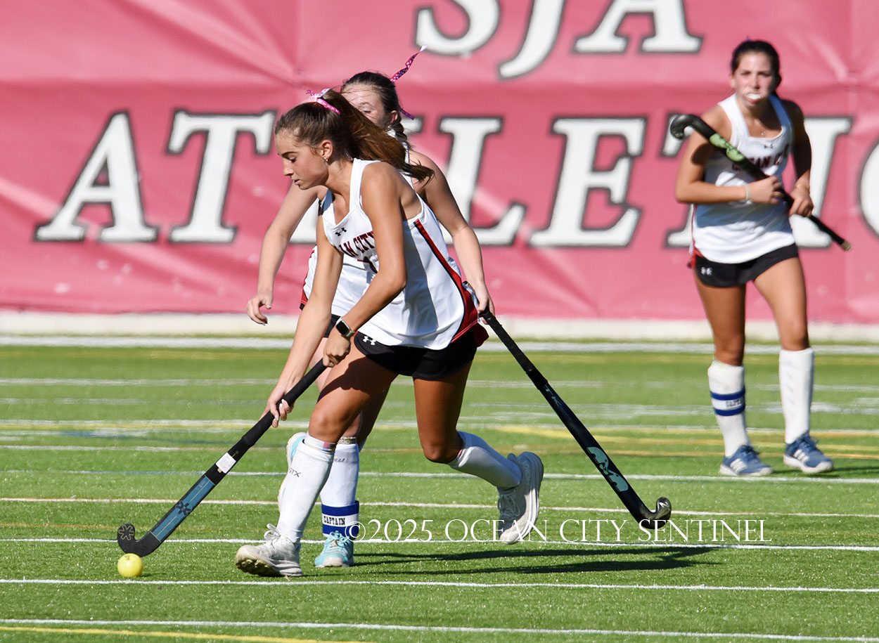 The two teams were tied 1-1 until near the end of the first half after St. Joe’s Stella Devlin scored and Ocean City’s Casey Adamson tied things up. With time running out in the half, Nina Aponte, who provided the assist on Devlin’s score, made it 2-1 off a corner play.