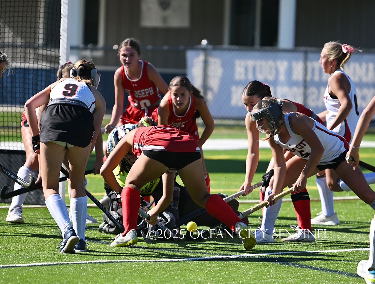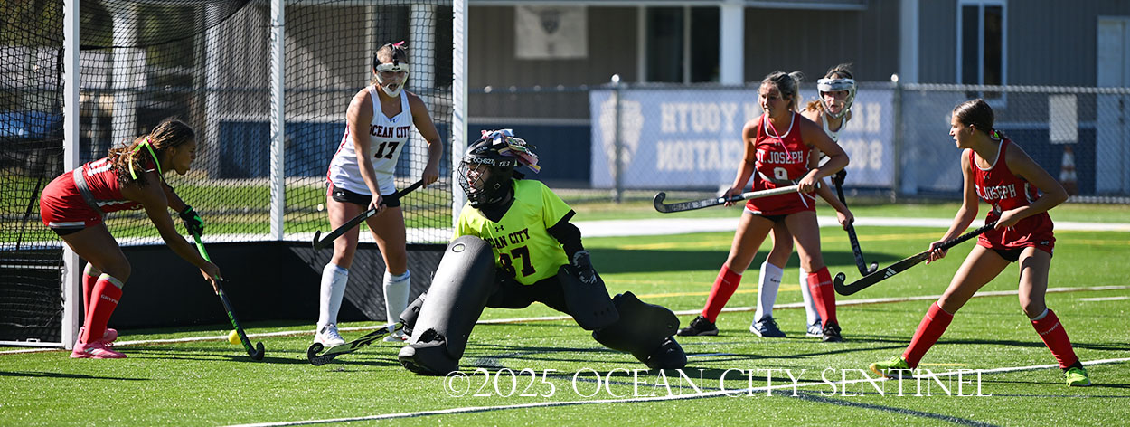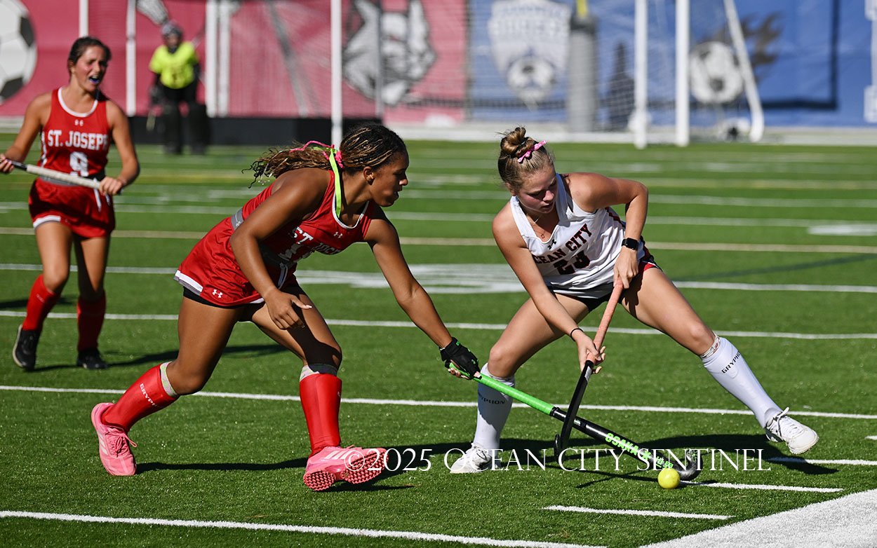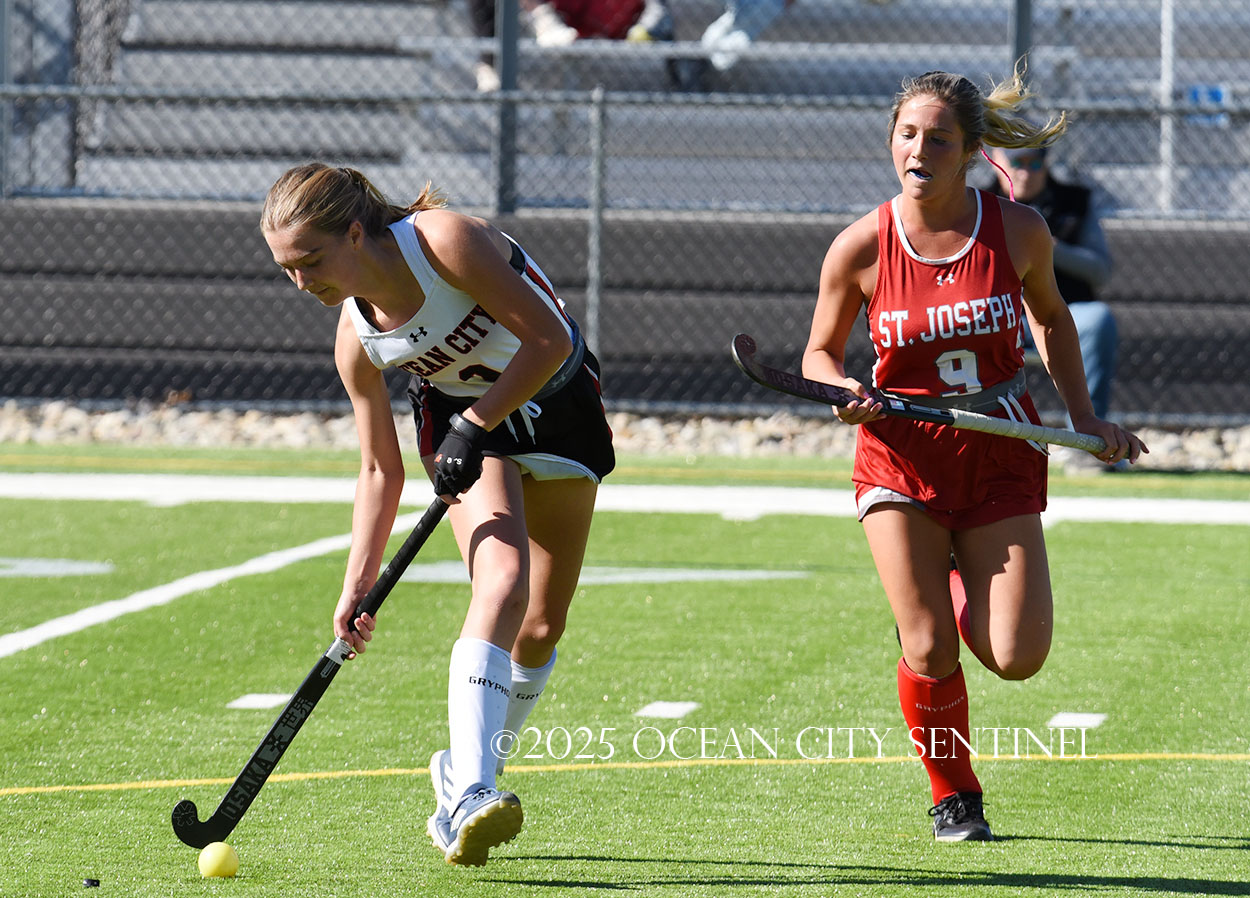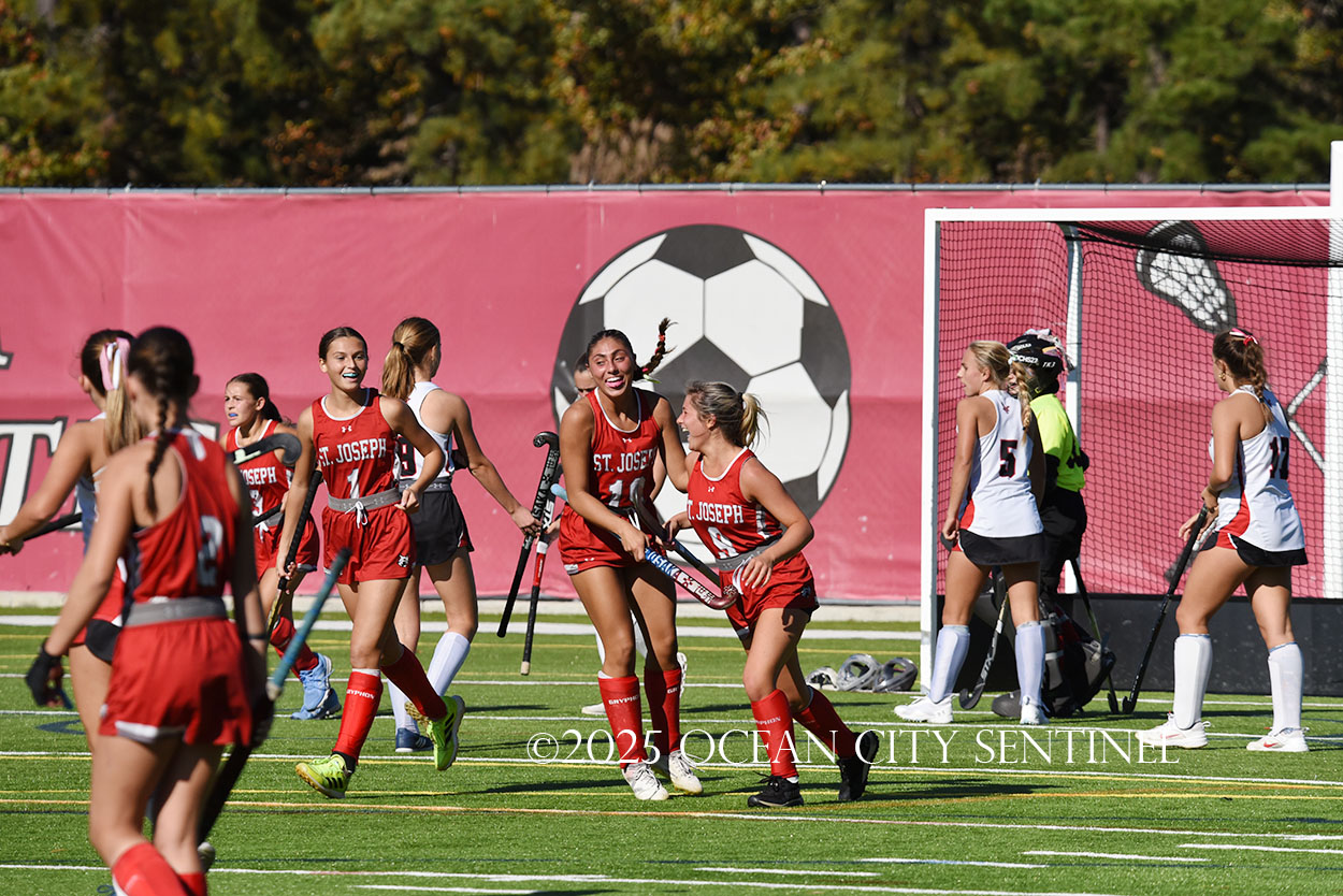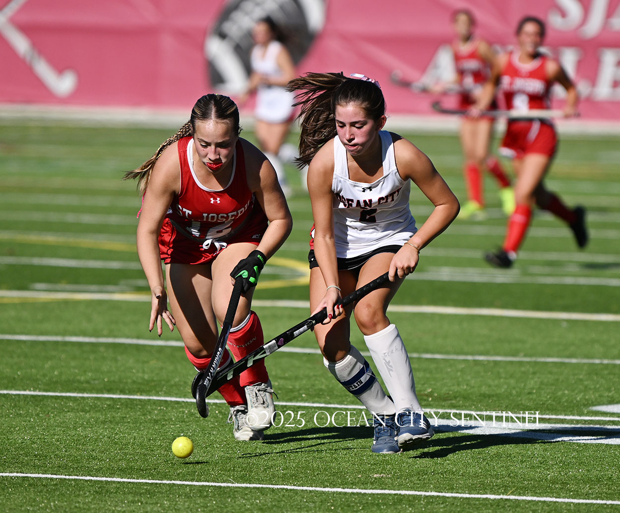 The two teams were tied 1-1 until near the end of the first half after St. Joe’s Stella Devlin scored and Ocean City’s Casey Adamson tied things up. With time running out in the half, Nina Aponte, who provided the assist on Devlin’s score, made it 2-1 off a corner play.