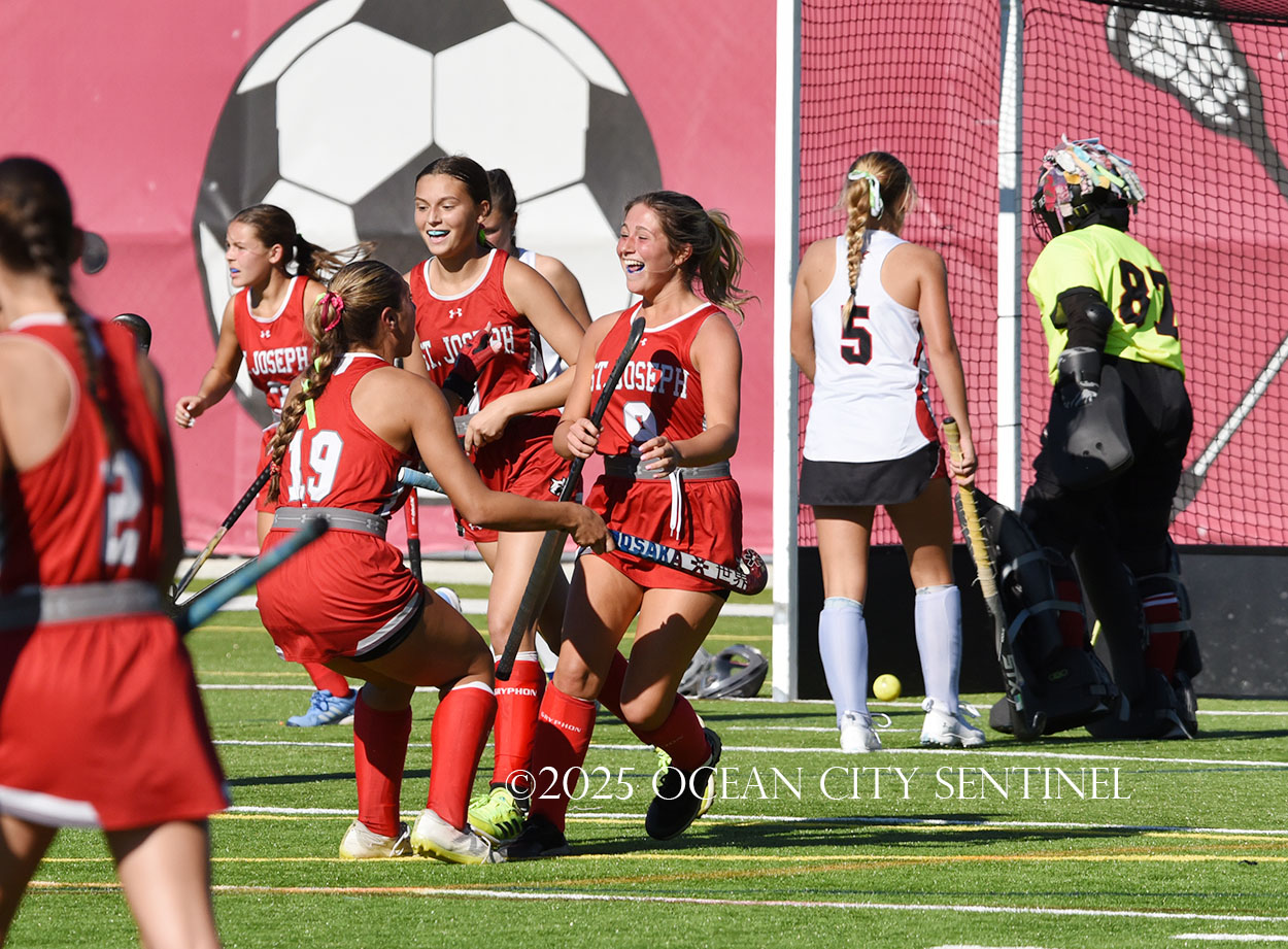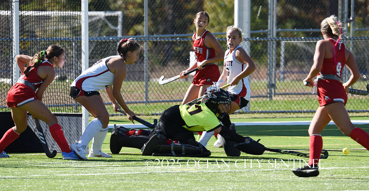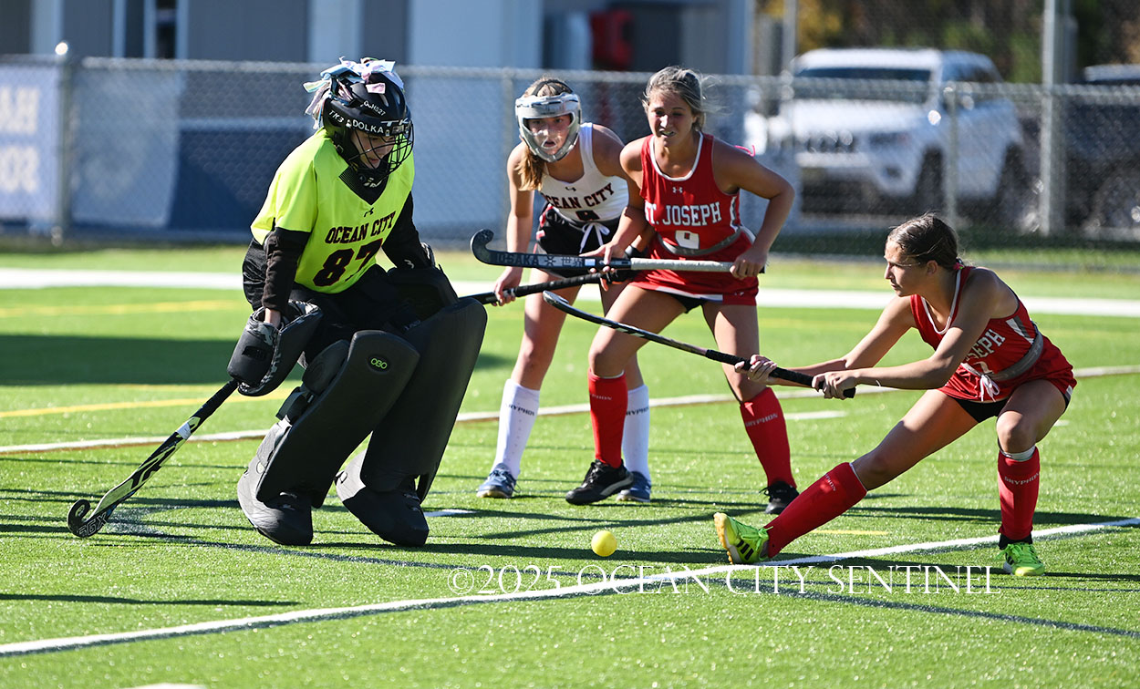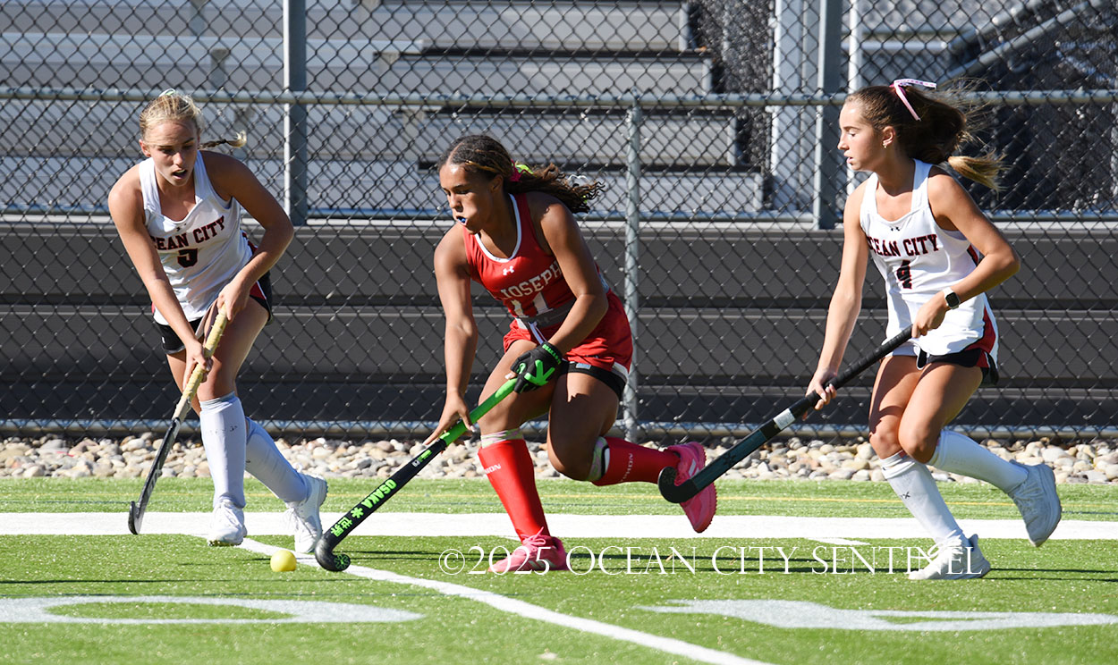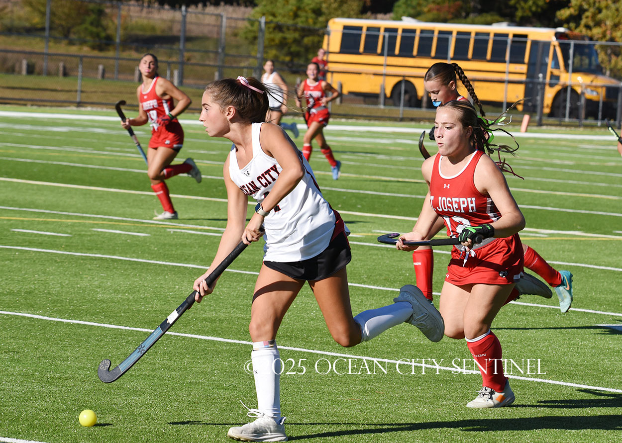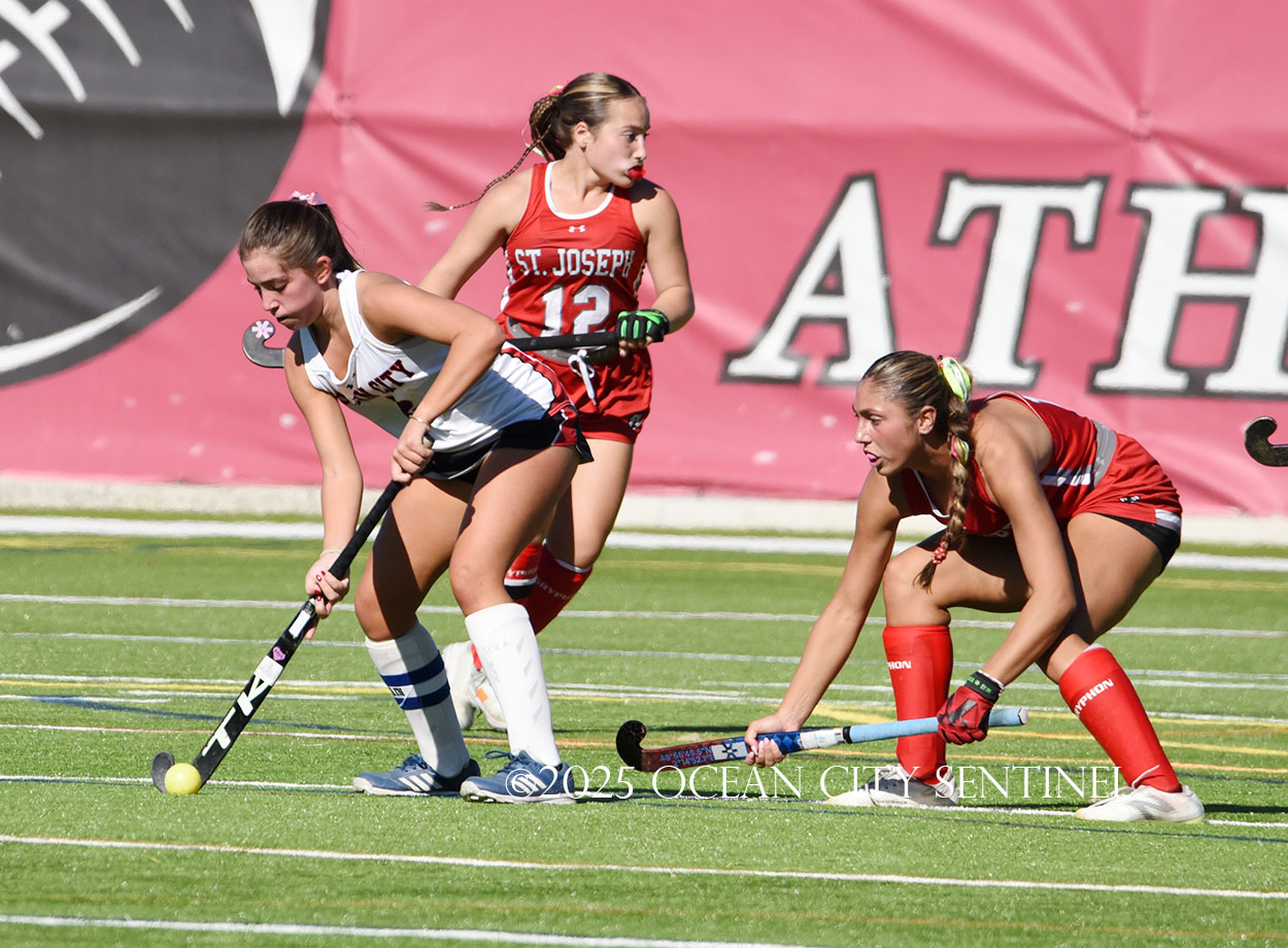 The two teams were tied 1-1 until near the end of the first half after St. Joe’s Stella Devlin scored and Ocean City’s Casey Adamson tied things up. With time running out in the half, Nina Aponte, who provided the assist on Devlin’s score, made it 2-1 off a corner play.