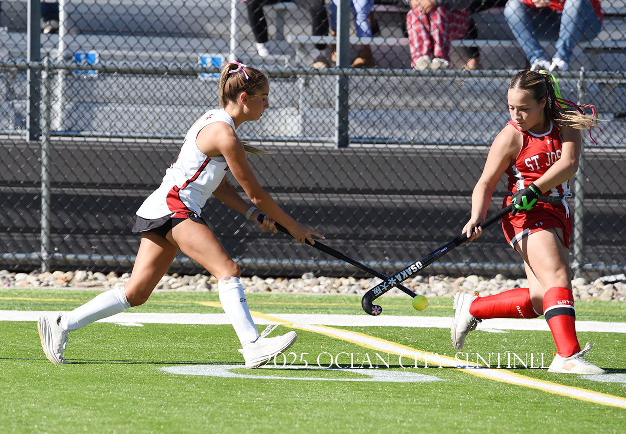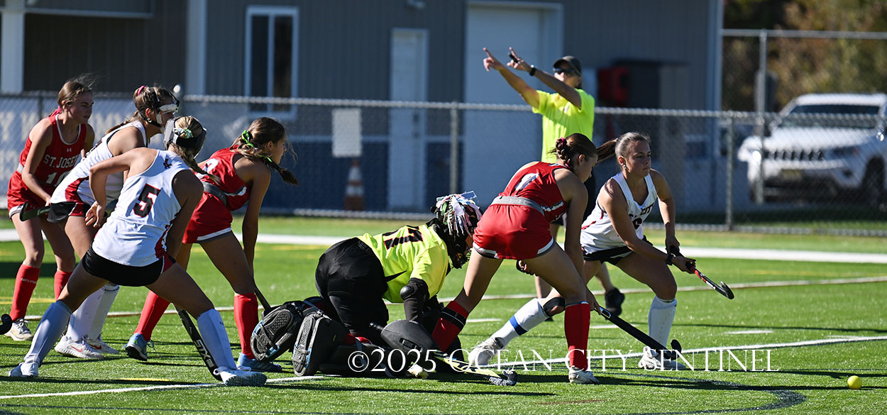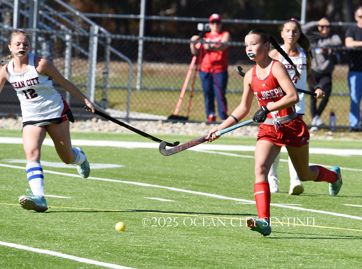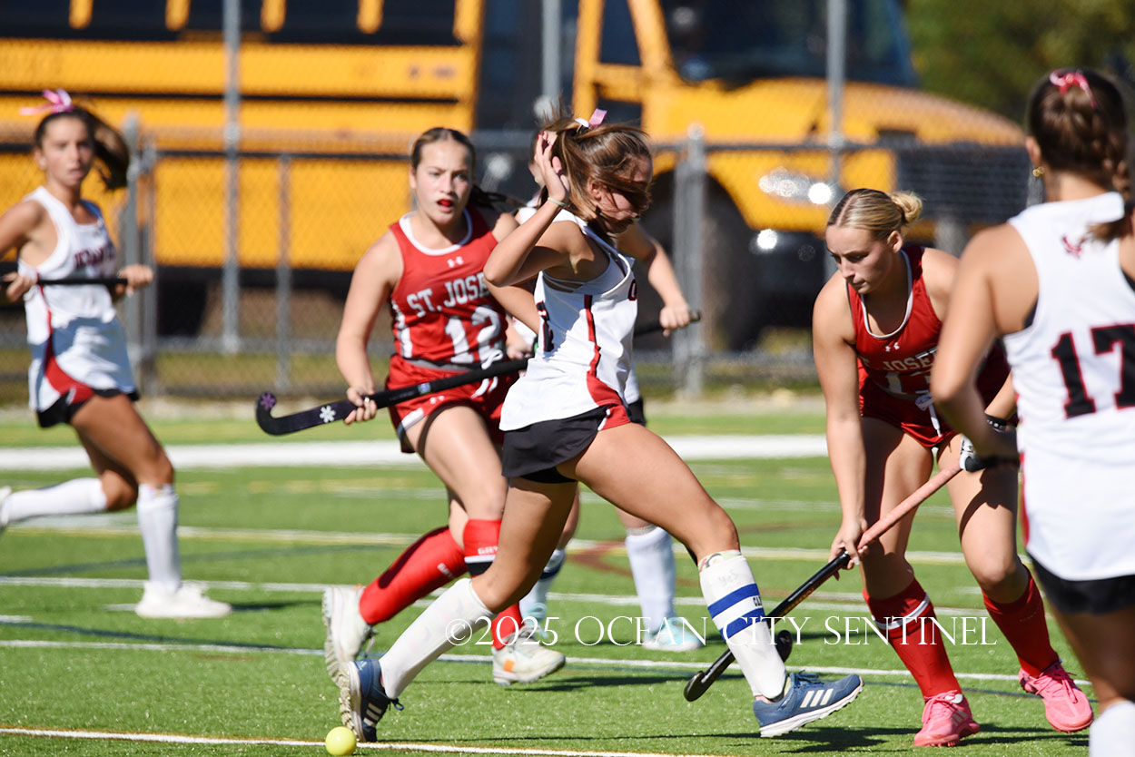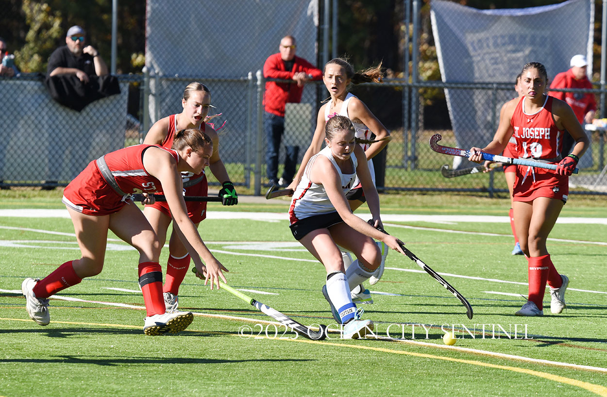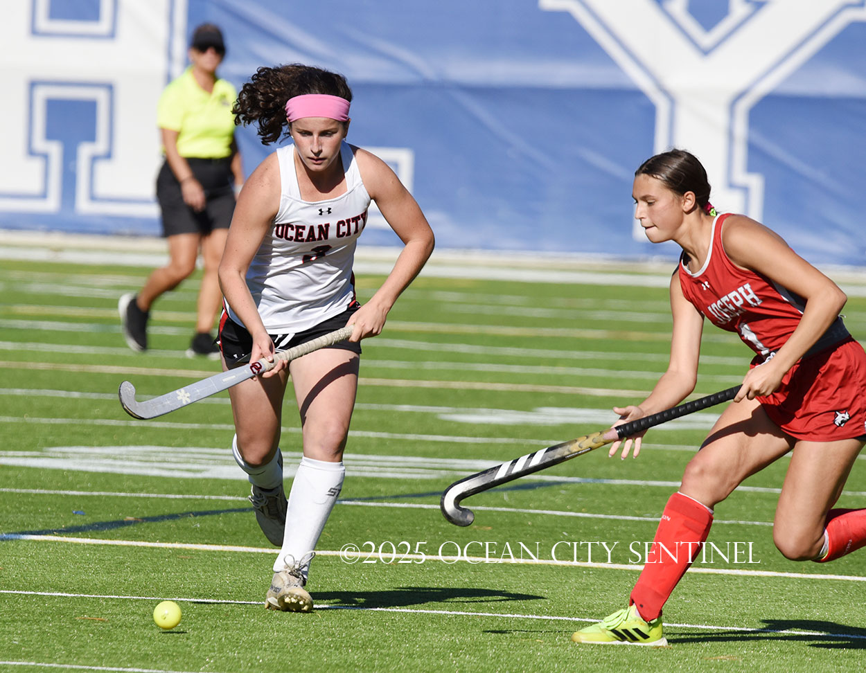 The two teams were tied 1-1 until near the end of the first half after St. Joe’s Stella Devlin scored and Ocean City’s Casey Adamson tied things up. With time running out in the half, Nina Aponte, who provided the assist on Devlin’s score, made it 2-1 off a corner play.