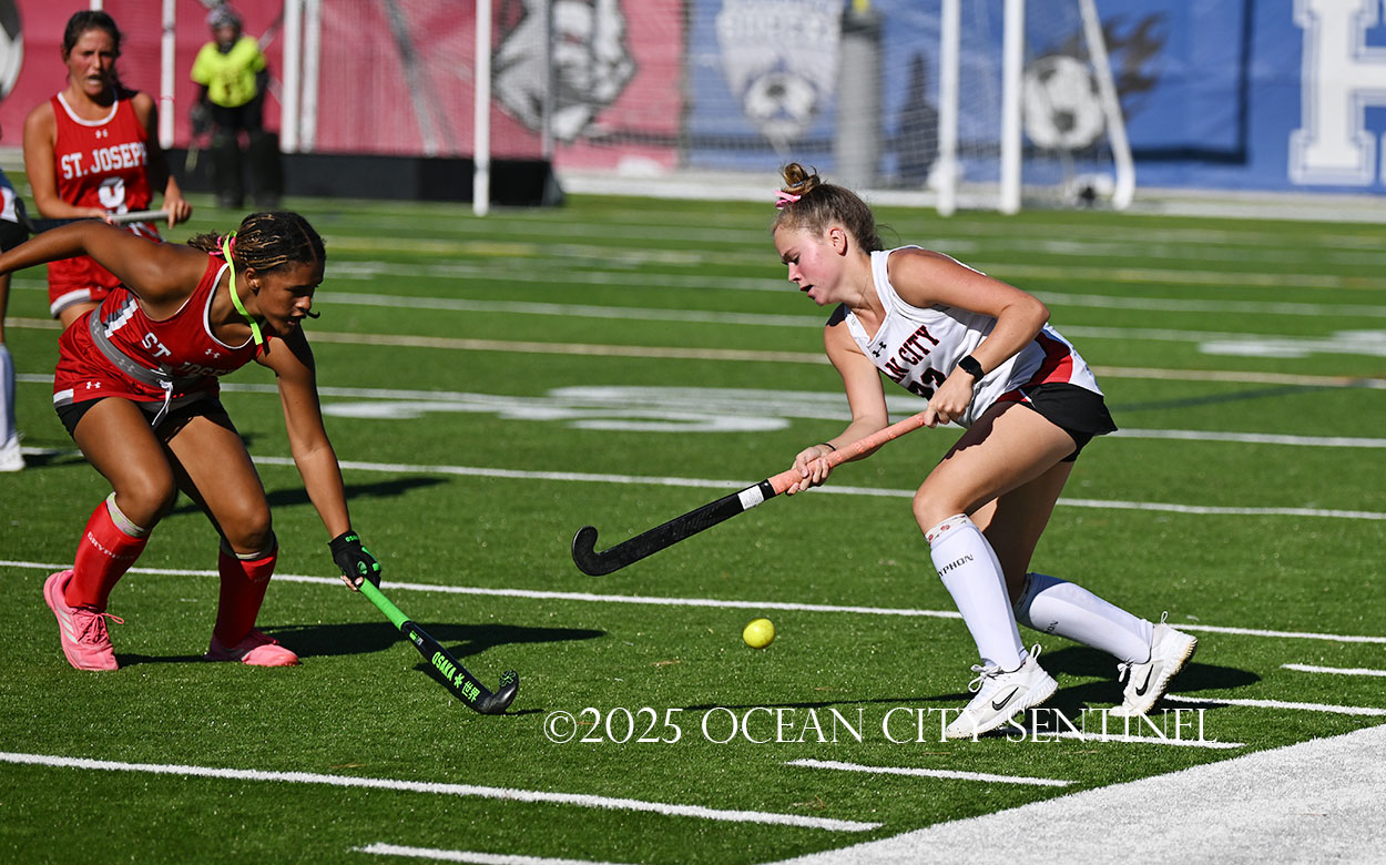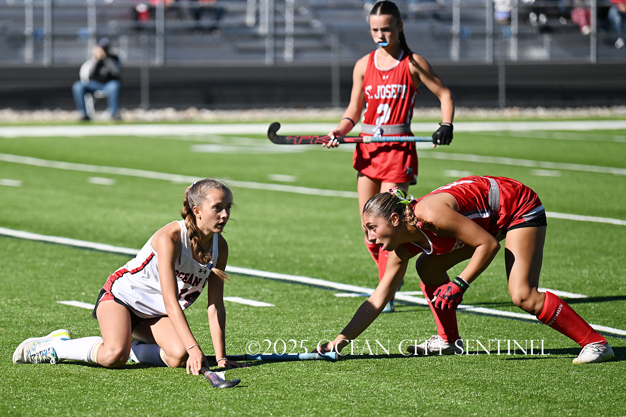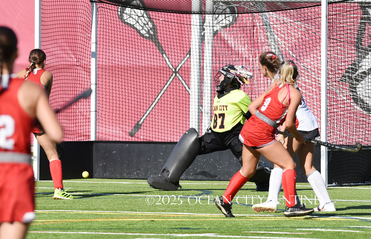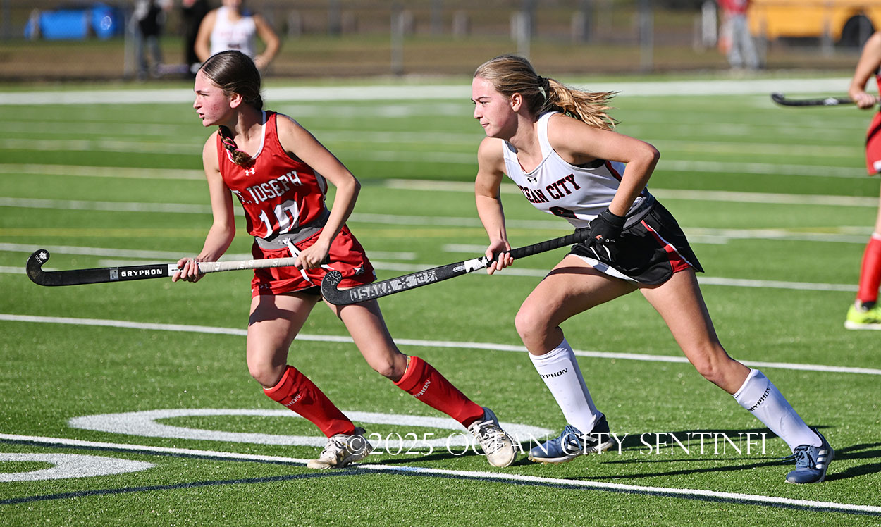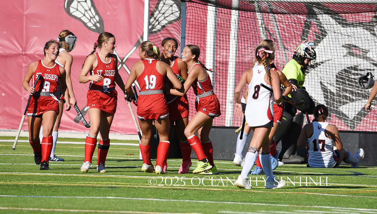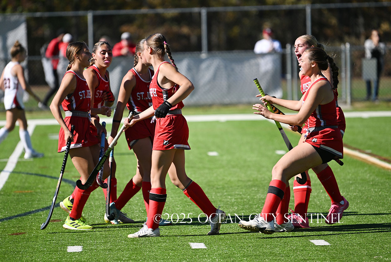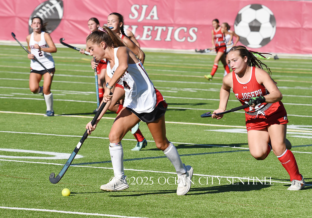 The two teams were tied 1-1 until near the end of the first half after St. Joe’s Stella Devlin scored and Ocean City’s Casey Adamson tied things up. With time running out in the half, Nina Aponte, who provided the assist on Devlin’s score, made it 2-1 off a corner play.
