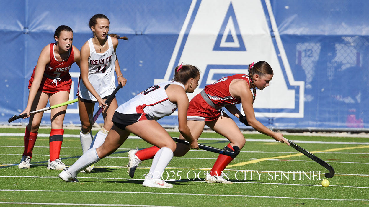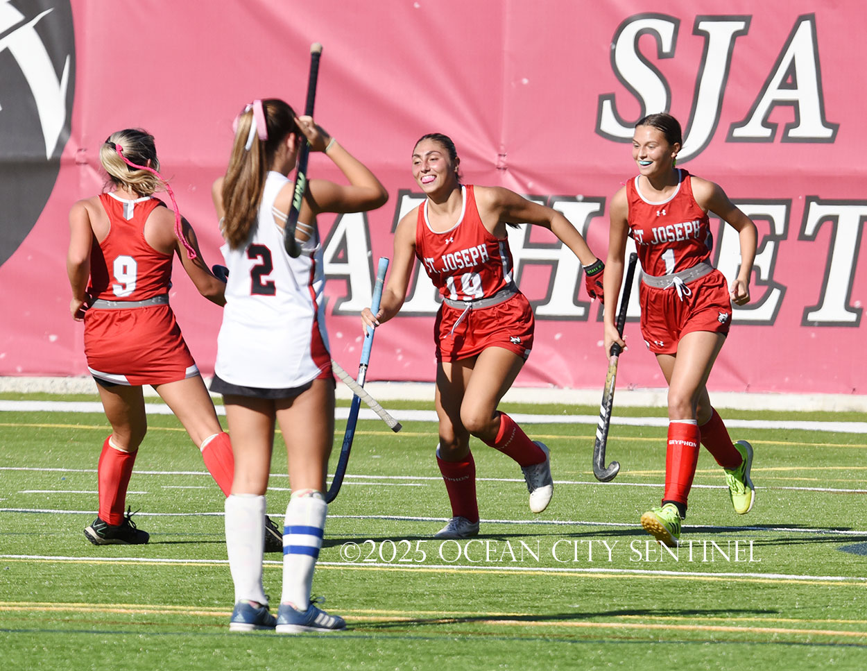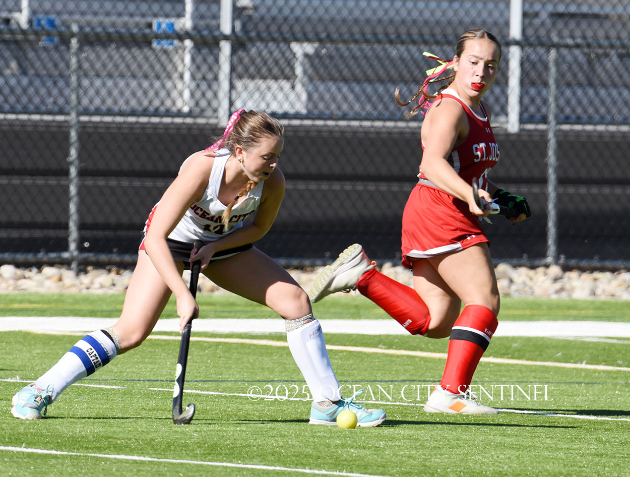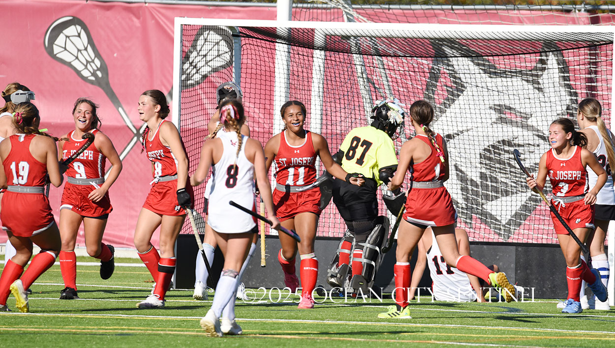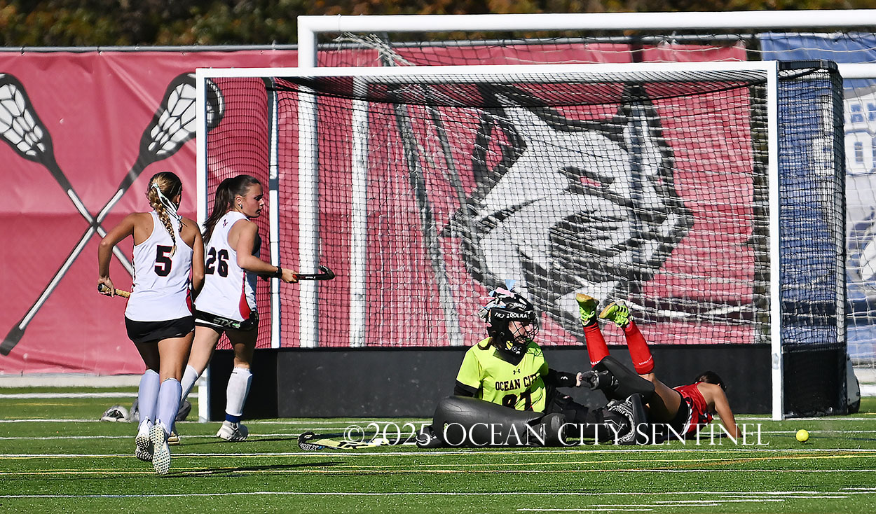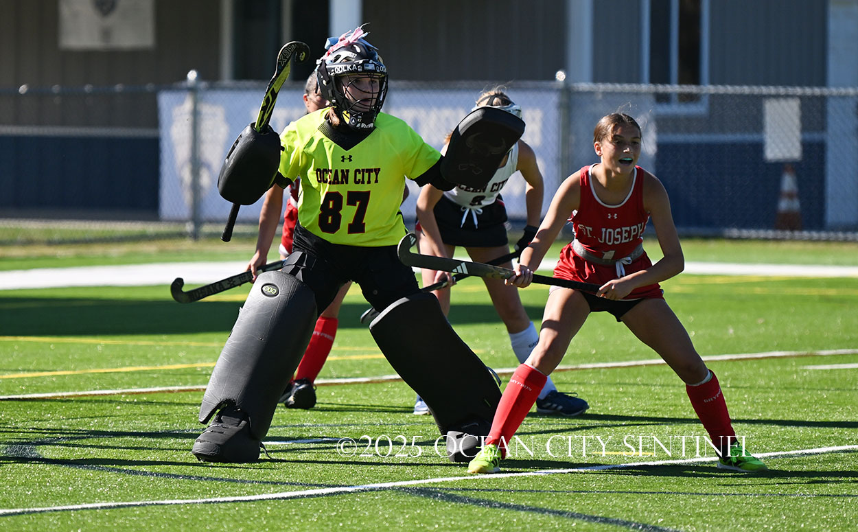 The two teams were tied 1-1 until near the end of the first half after St. Joe’s Stella Devlin scored and Ocean City’s Casey Adamson tied things up. With time running out in the half, Nina Aponte, who provided the assist on Devlin’s score, made it 2-1 off a corner play.