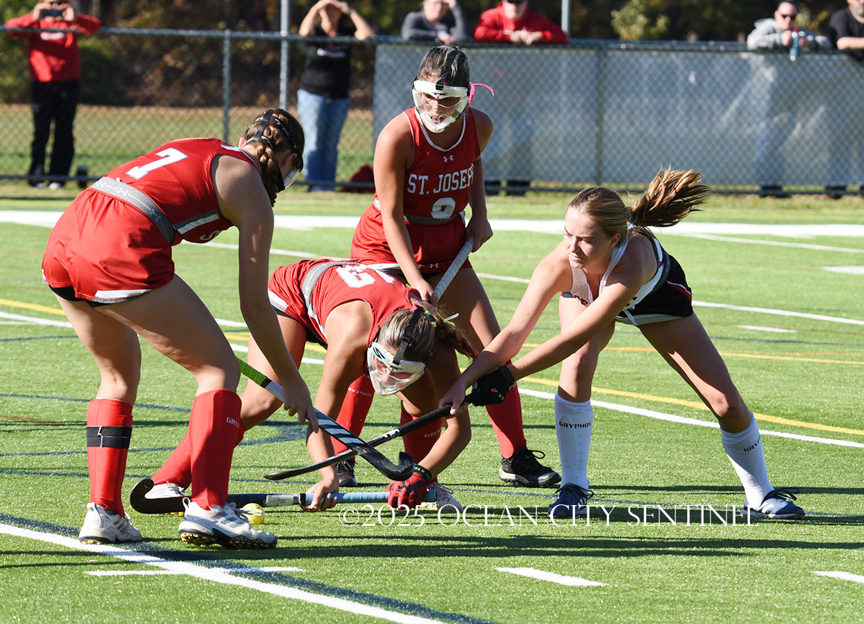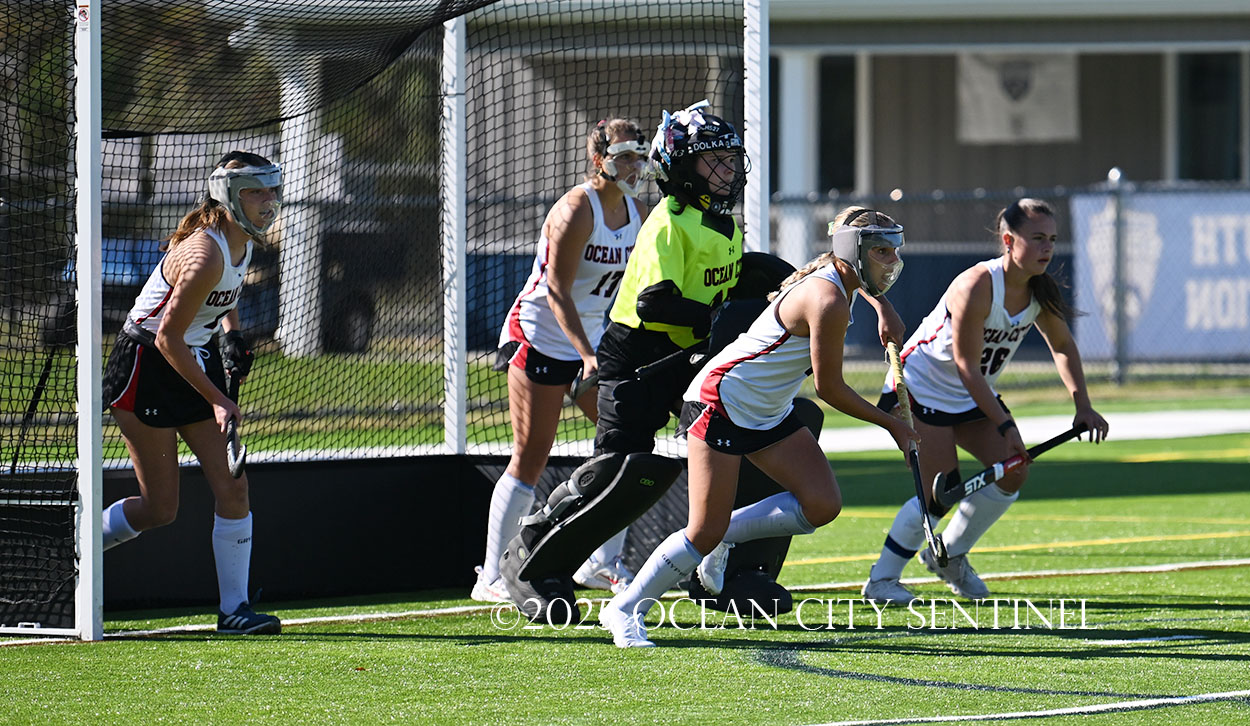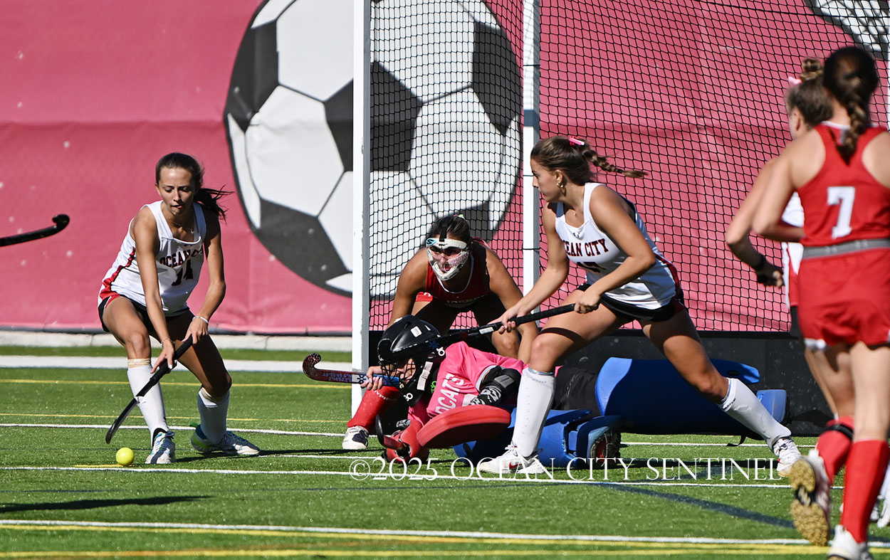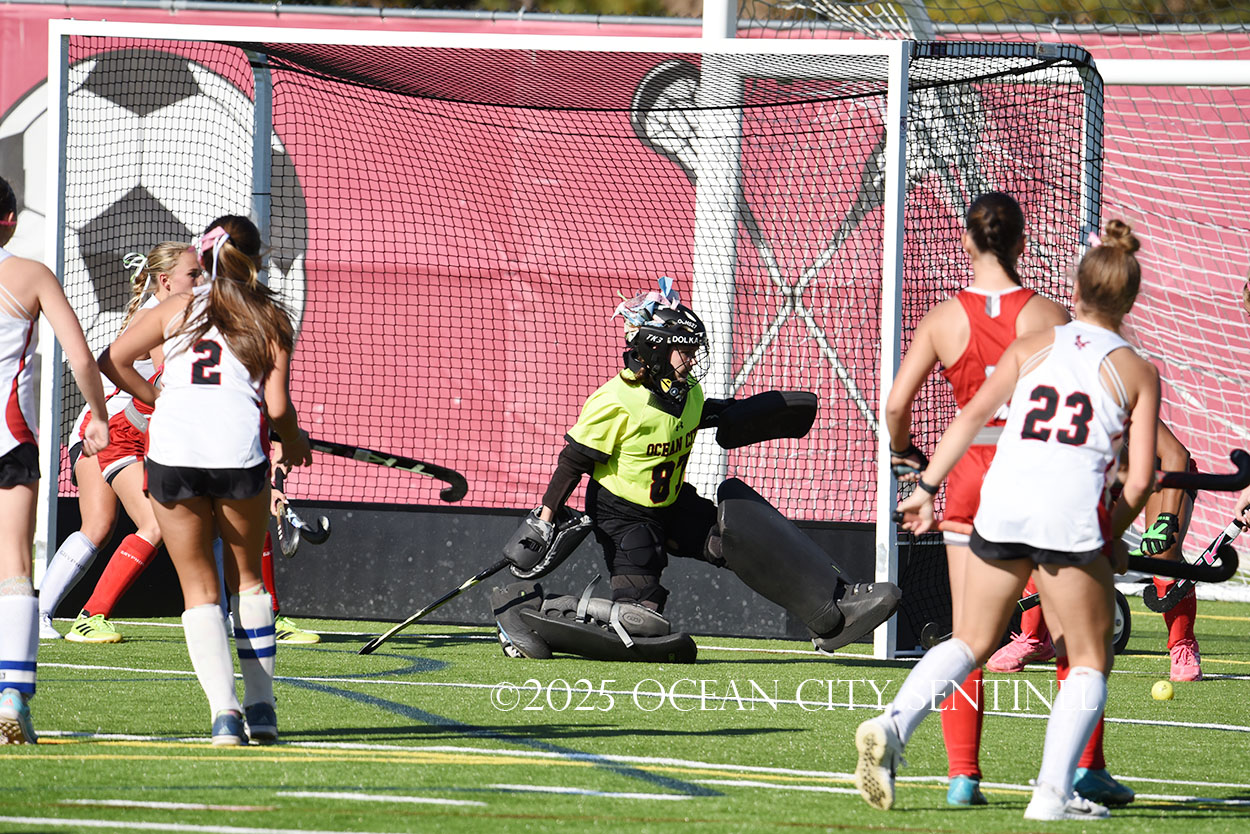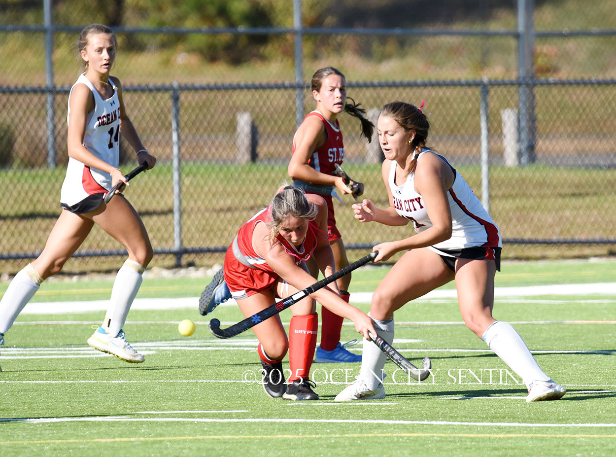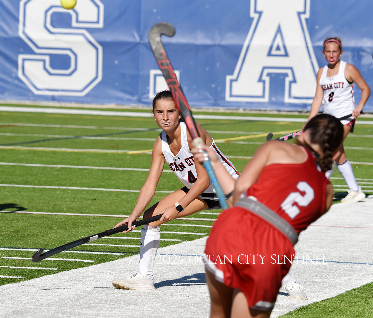 The two teams were tied 1-1 until near the end of the first half after St. Joe’s Stella Devlin scored and Ocean City’s Casey Adamson tied things up. With time running out in the half, Nina Aponte, who provided the assist on Devlin’s score, made it 2-1 off a corner play.