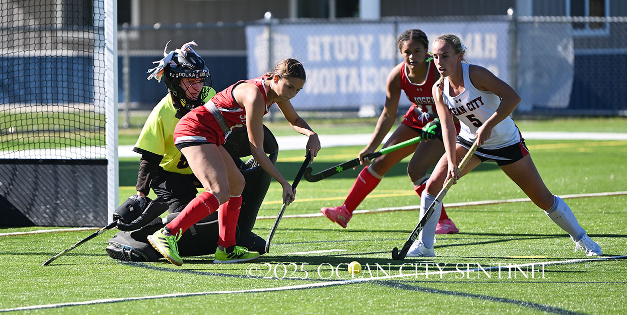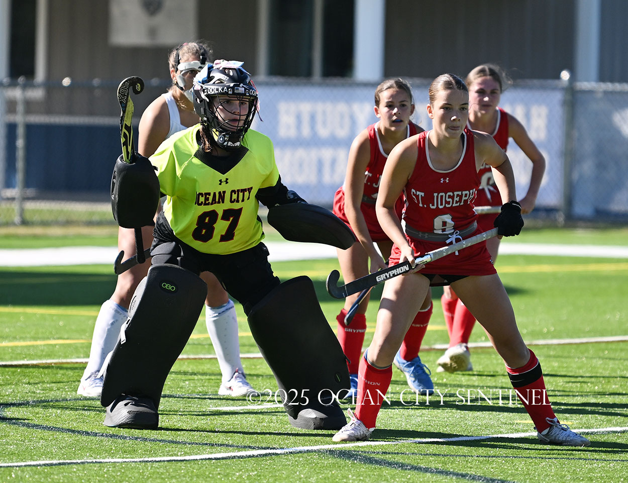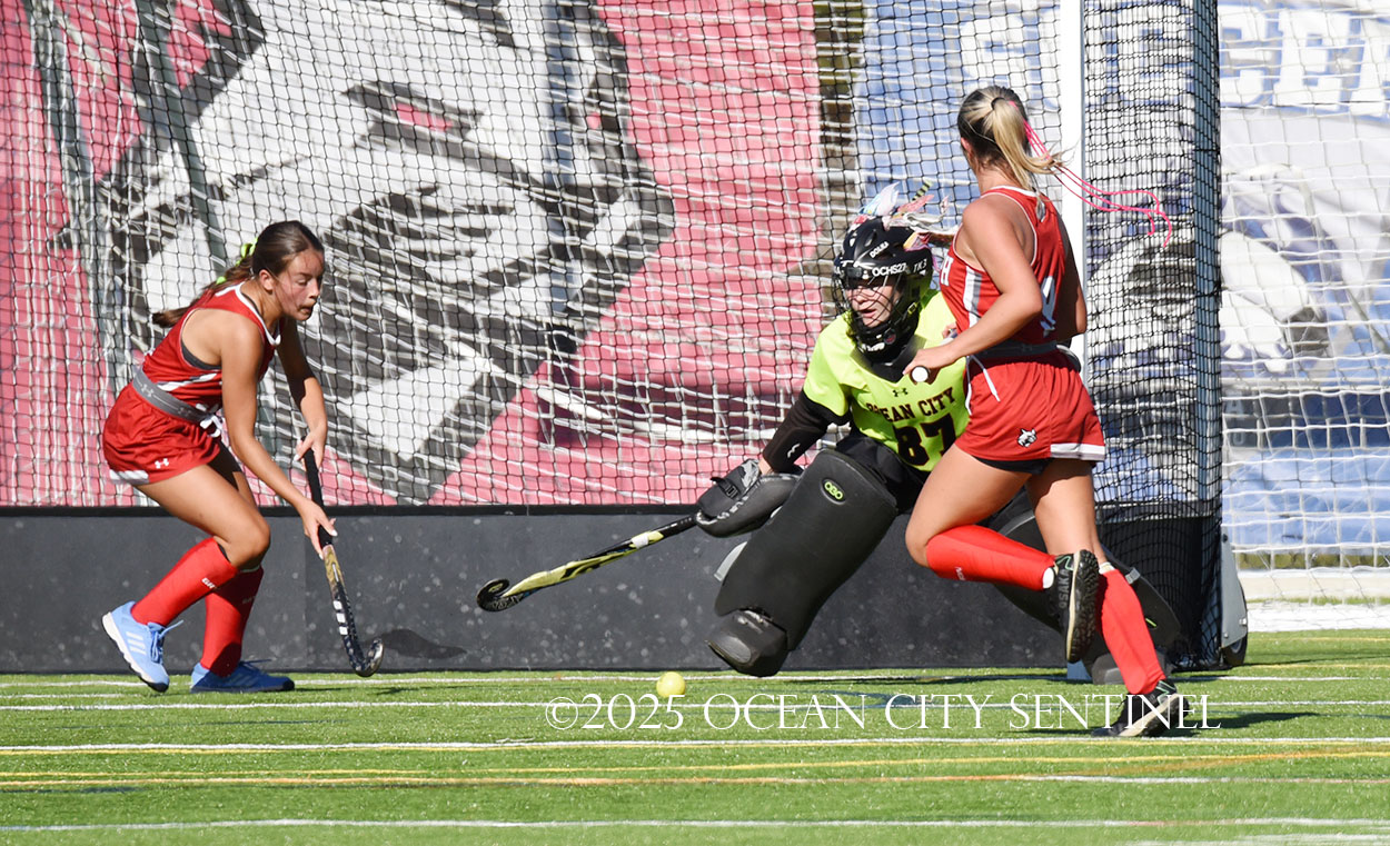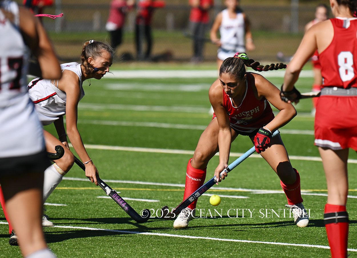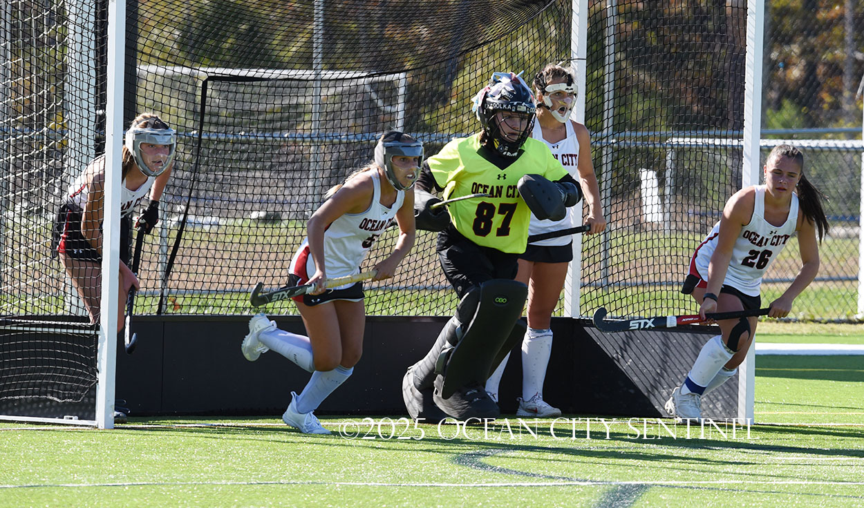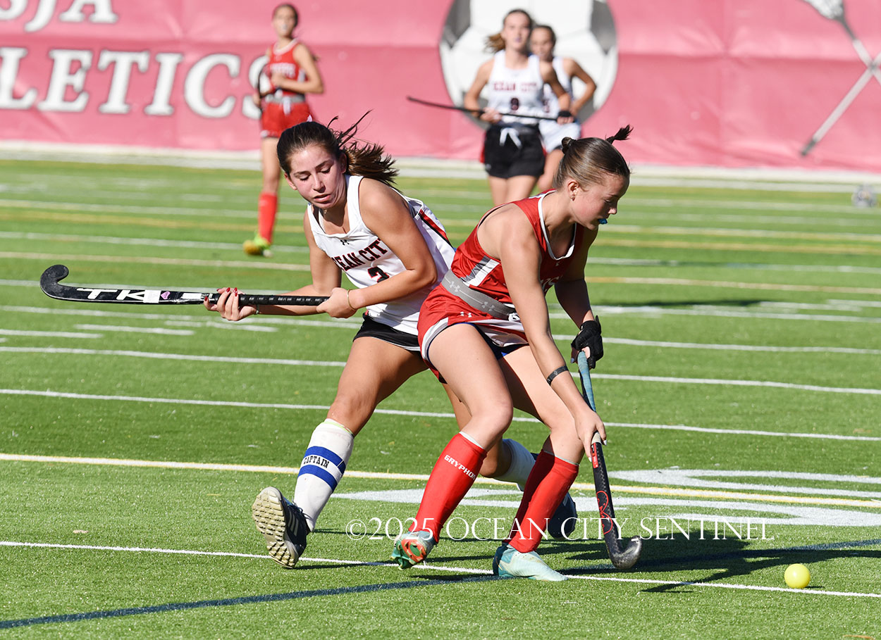 The two teams were tied 1-1 until near the end of the first half after St. Joe’s Stella Devlin scored and Ocean City’s Casey Adamson tied things up. With time running out in the half, Nina Aponte, who provided the assist on Devlin’s score, made it 2-1 off a corner play.