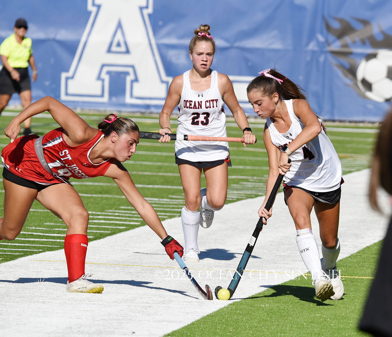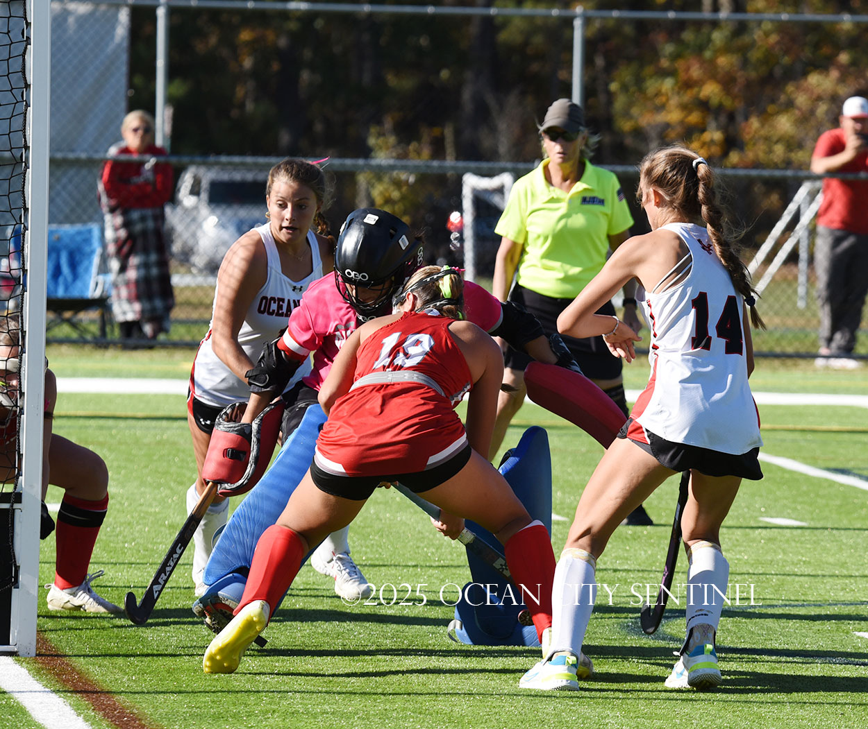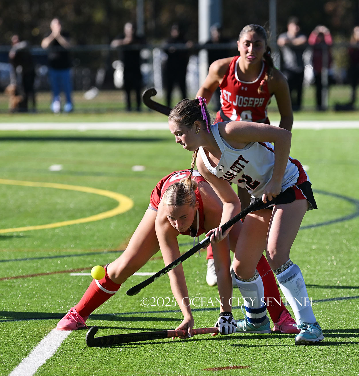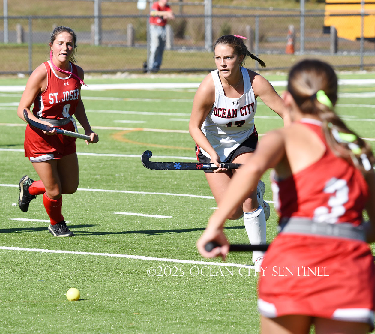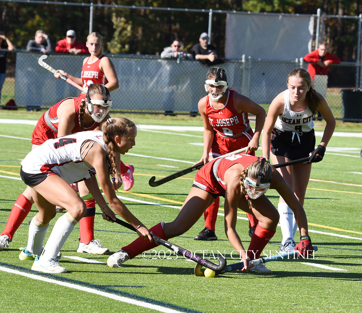 The two teams were tied 1-1 until near the end of the first half after St. Joe’s Stella Devlin scored and Ocean City’s Casey Adamson tied things up. With time running out in the half, Nina Aponte, who provided the assist on Devlin’s score, made it 2-1 off a corner play.