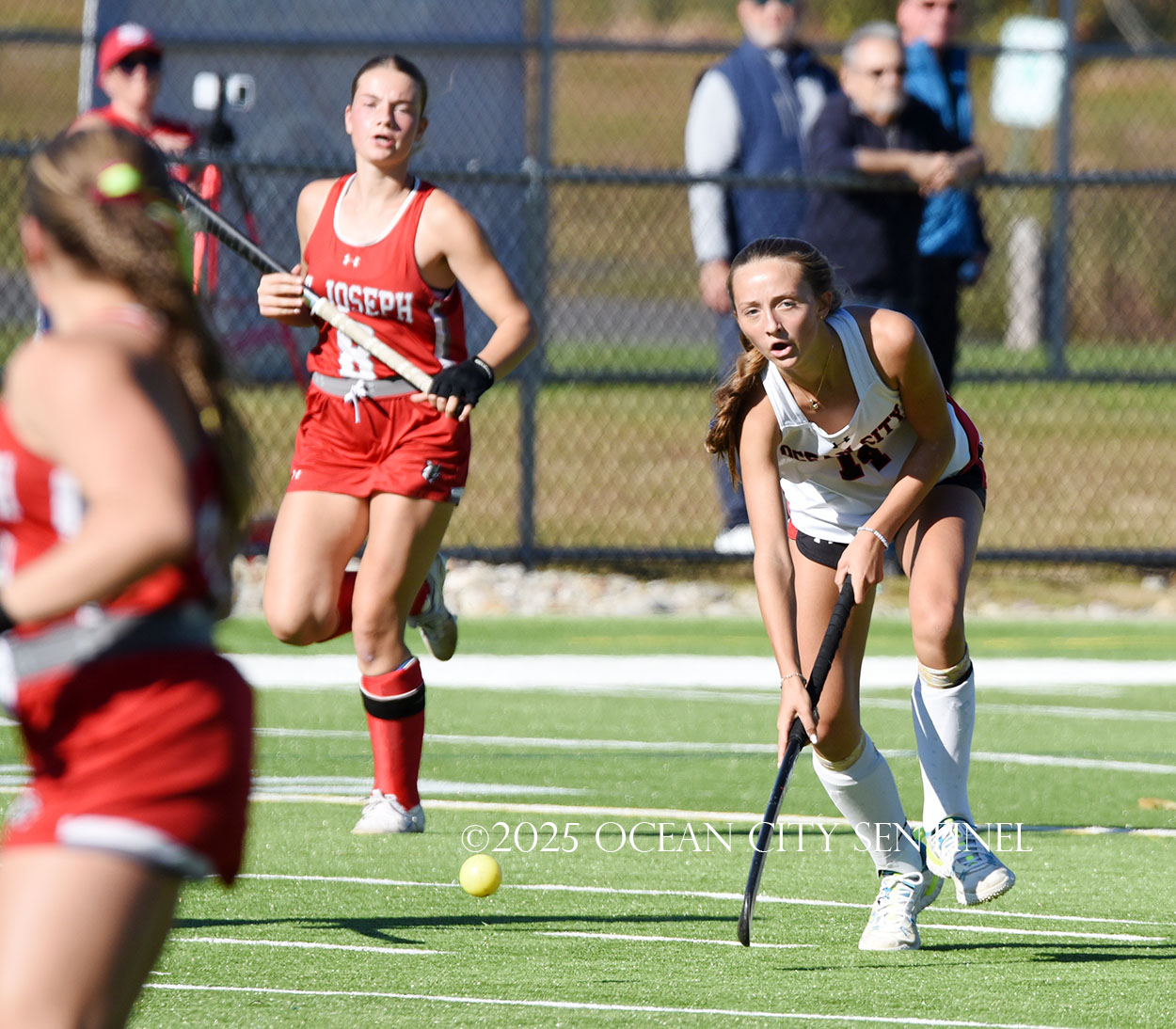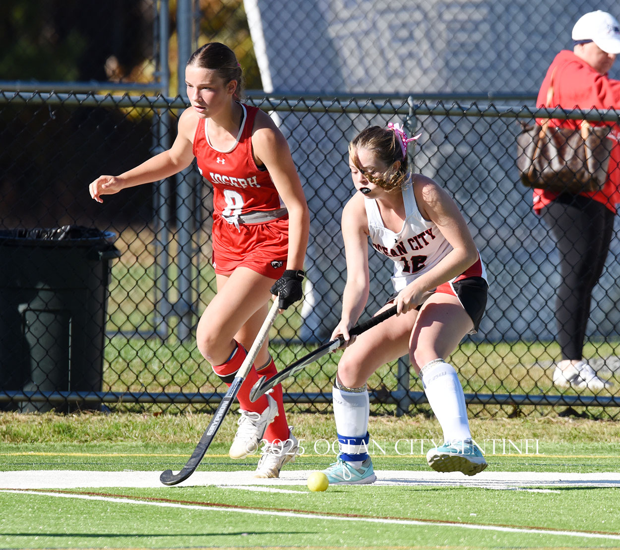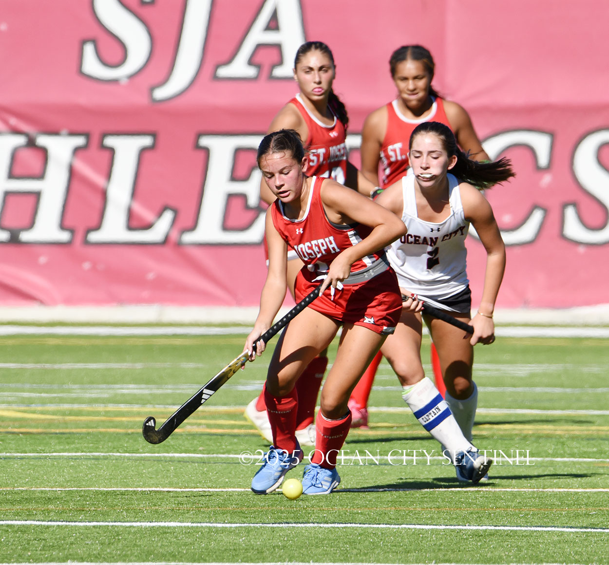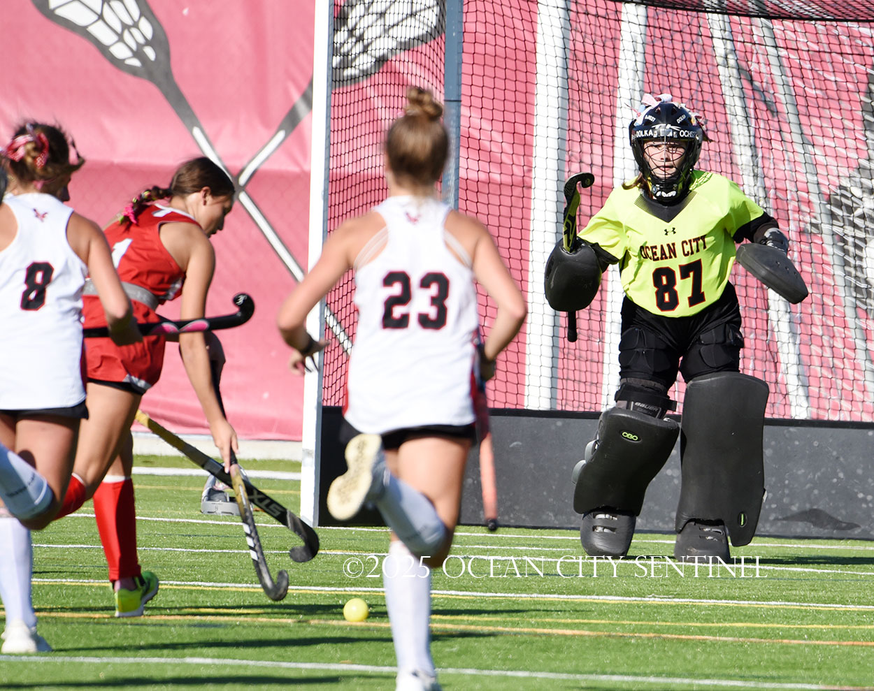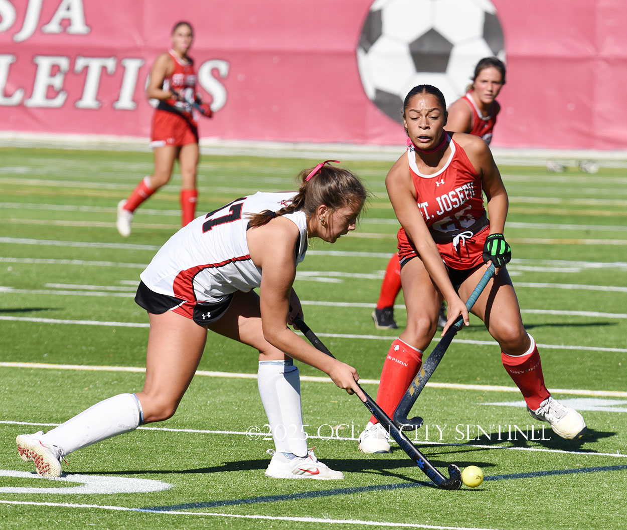 The two teams were tied 1-1 until near the end of the first half after St. Joe’s Stella Devlin scored and Ocean City’s Casey Adamson tied things up. With time running out in the half, Nina Aponte, who provided the assist on Devlin’s score, made it 2-1 off a corner play.