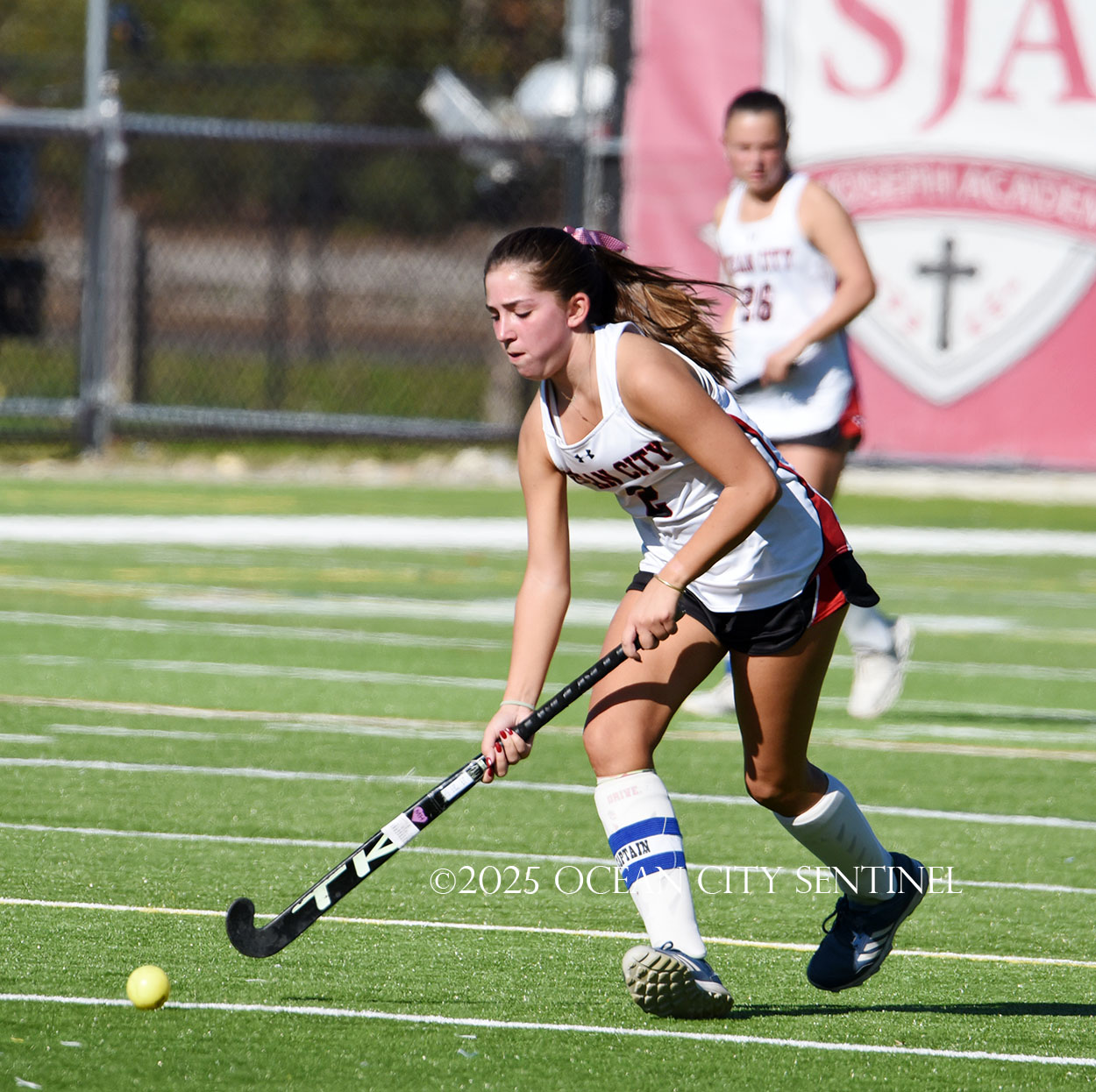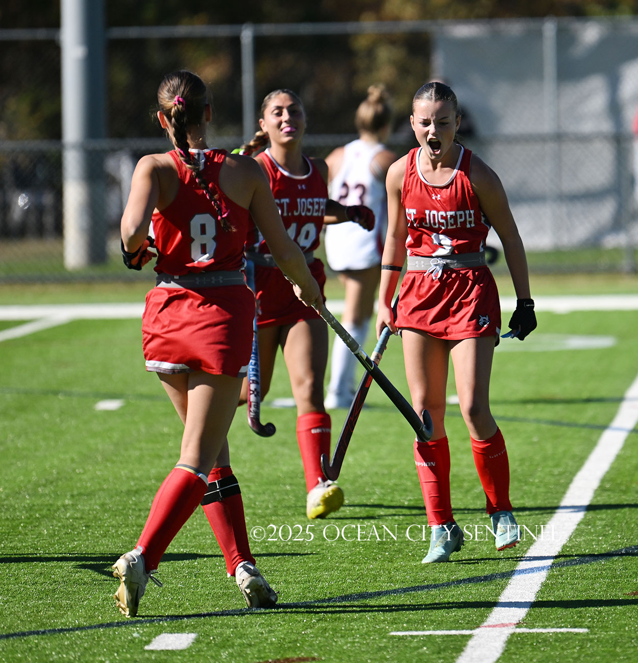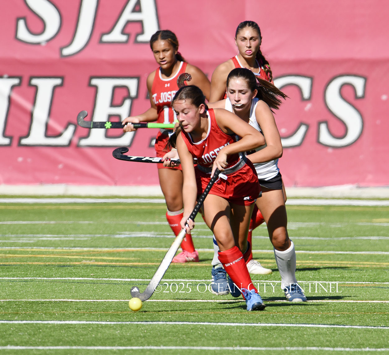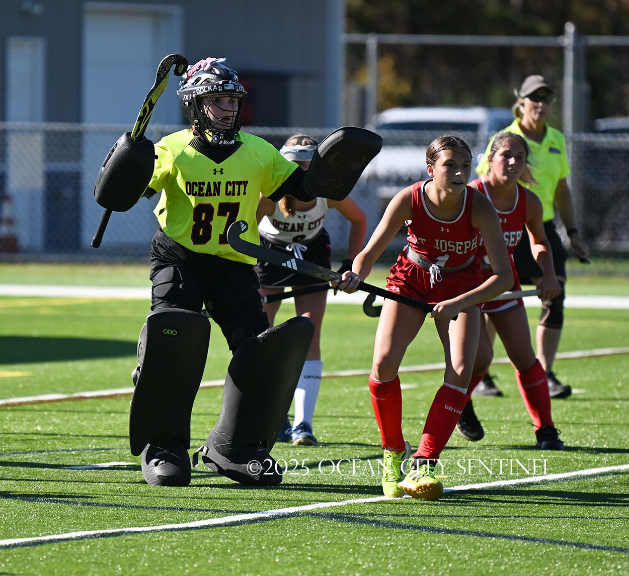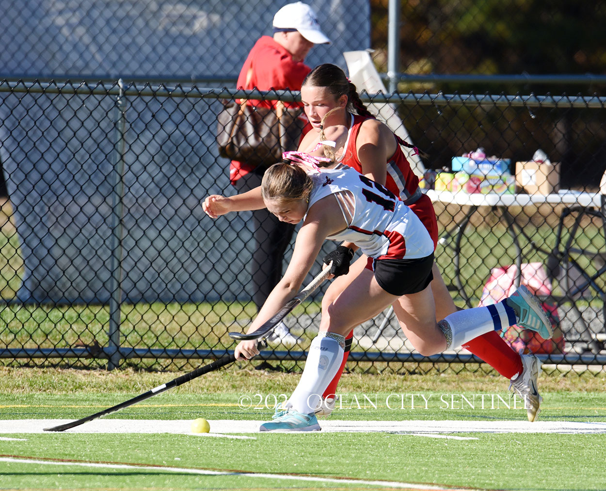 The two teams were tied 1-1 until near the end of the first half after St. Joe’s Stella Devlin scored and Ocean City’s Casey Adamson tied things up. With time running out in the half, Nina Aponte, who provided the assist on Devlin’s score, made it 2-1 off a corner play.